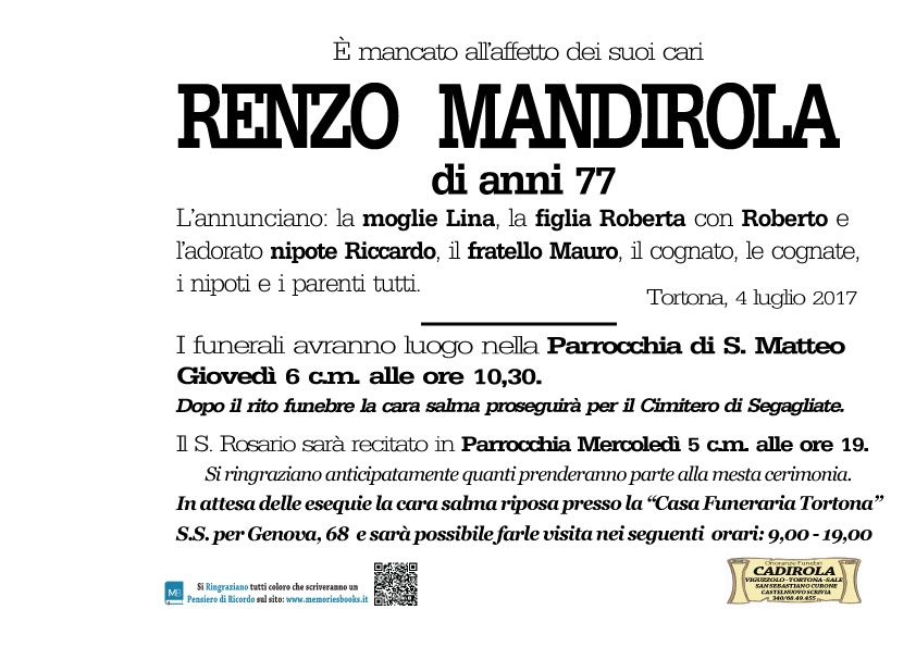 Clicca il pulsante qui sotto per visualizzare sulla mappa il luogo dove riposa RENZO MANDIROLA.