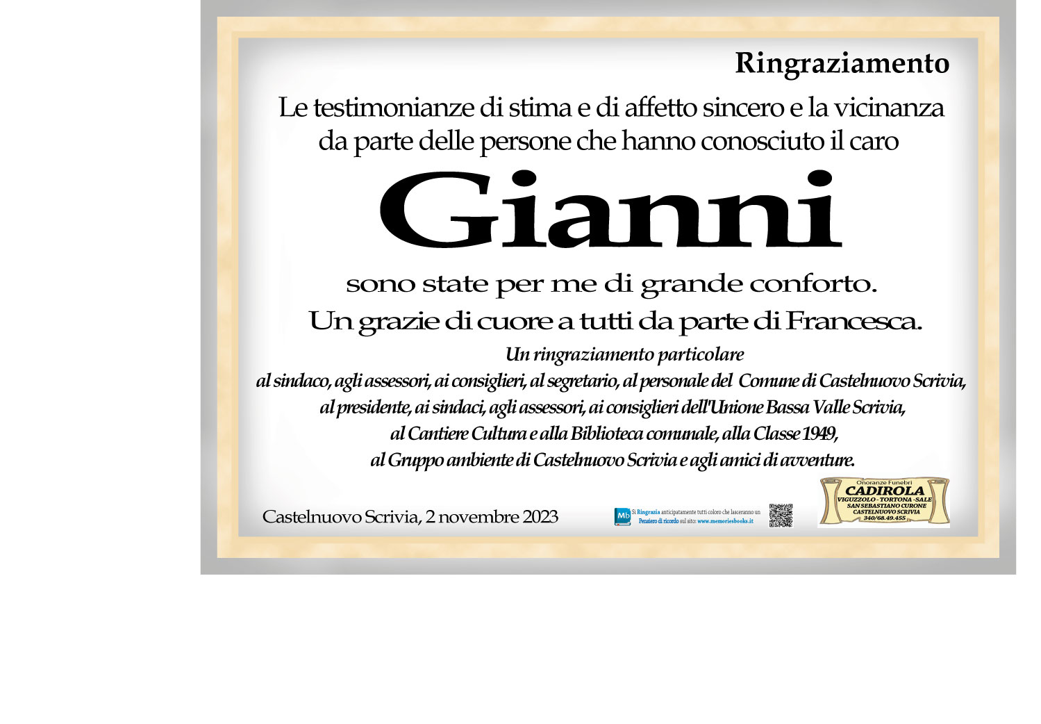 Ciao Gianni, ti ricorderemo sempre come persona eccezionale, onesta; all'interno della vita politica della nostra comunità, eri sempre disponibile con immensa cortesia ad ascoltare e risolvere i problemi dei tuoi concittadini. "Non piangete la sua assenza, sentitevi vicino, parlategli ancora, Vi amerà dal cielo come vi ha amati sulla terra." (Sant’Agostino). Con la preghiera e con tutto il nostro affetto abbracciamo Francesca in questo momento di lutto per l'improvvisa scomparsa del suo carissimo marito.