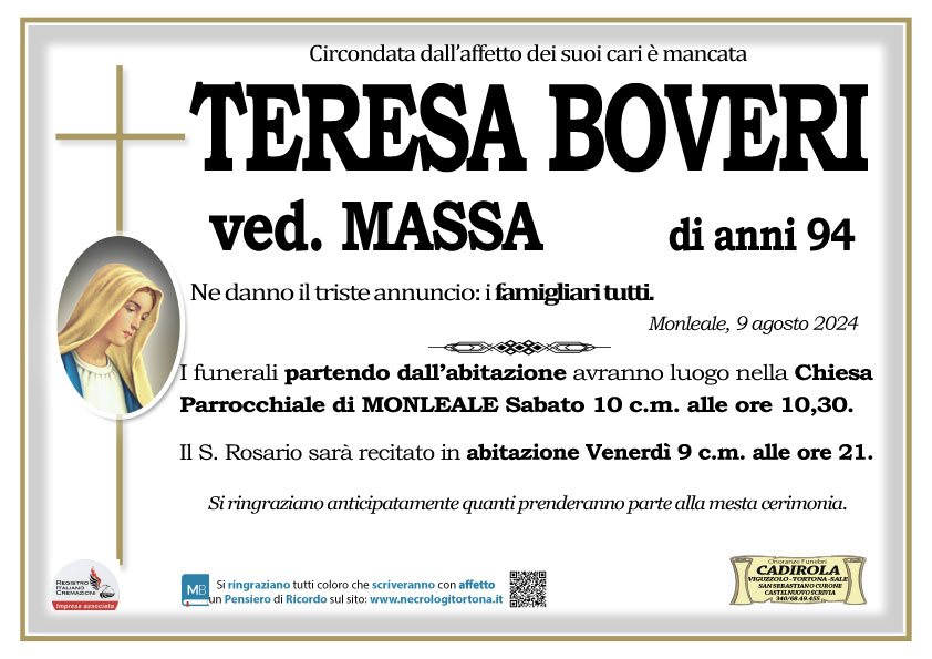 L'Amministrazione Comunale di Casalnoceto è vicina a Paola e Walter Massa per la perdita della cara mamma e sentitamente porge le più sentite condogliante.