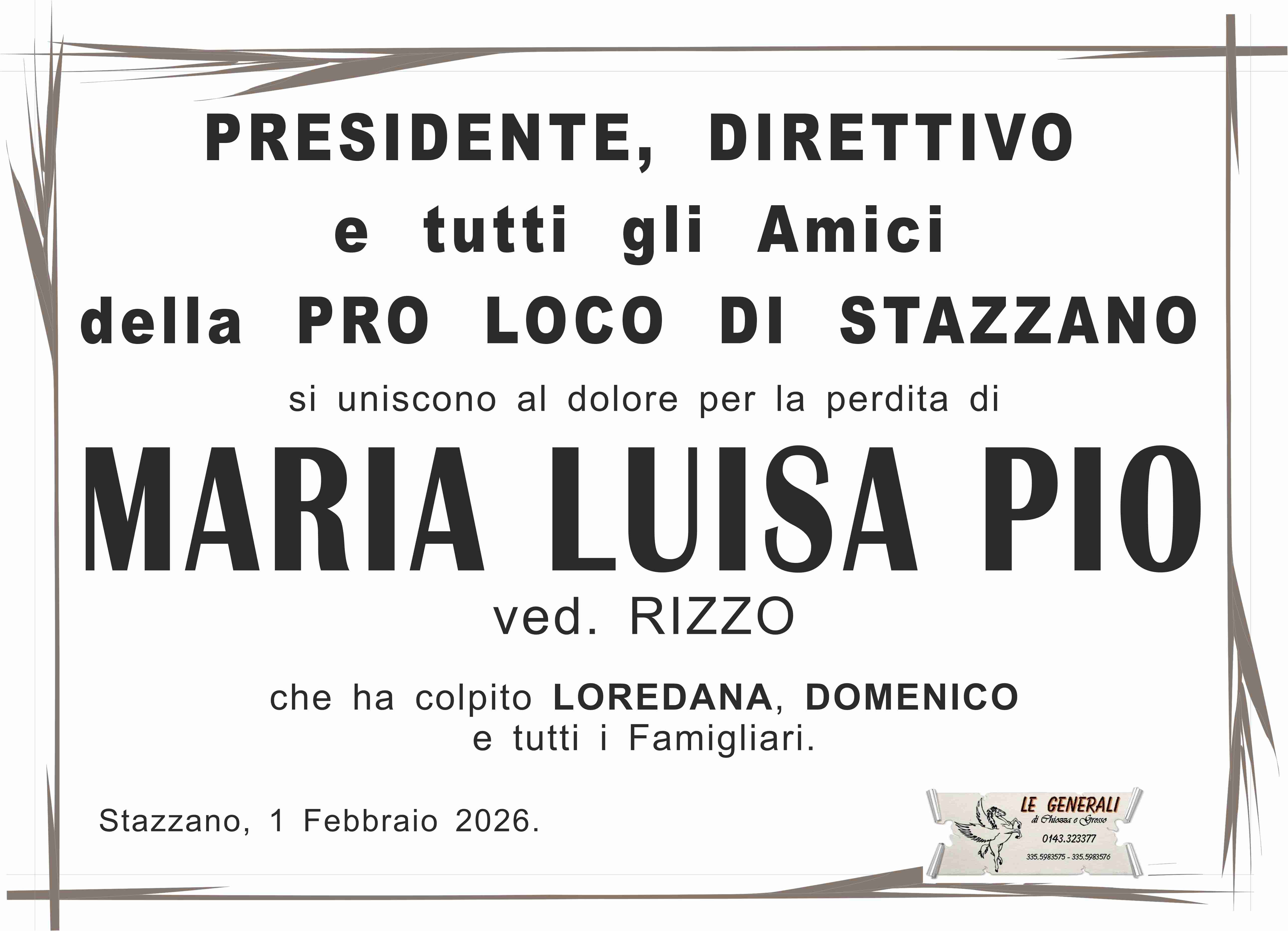 Io Elvira e mia mamma Assunta Beatrice vi stringiamo in un abbraccio a voi tutti per la scomparsa della vostra cara mamma, suocera e nonna Maria Luisa Pio ved. Rizzo e porto le mie più sentite condoglianze Che la terra le sia lieve Maria Luisa R.I.P. 😥🙏🙏 🌹