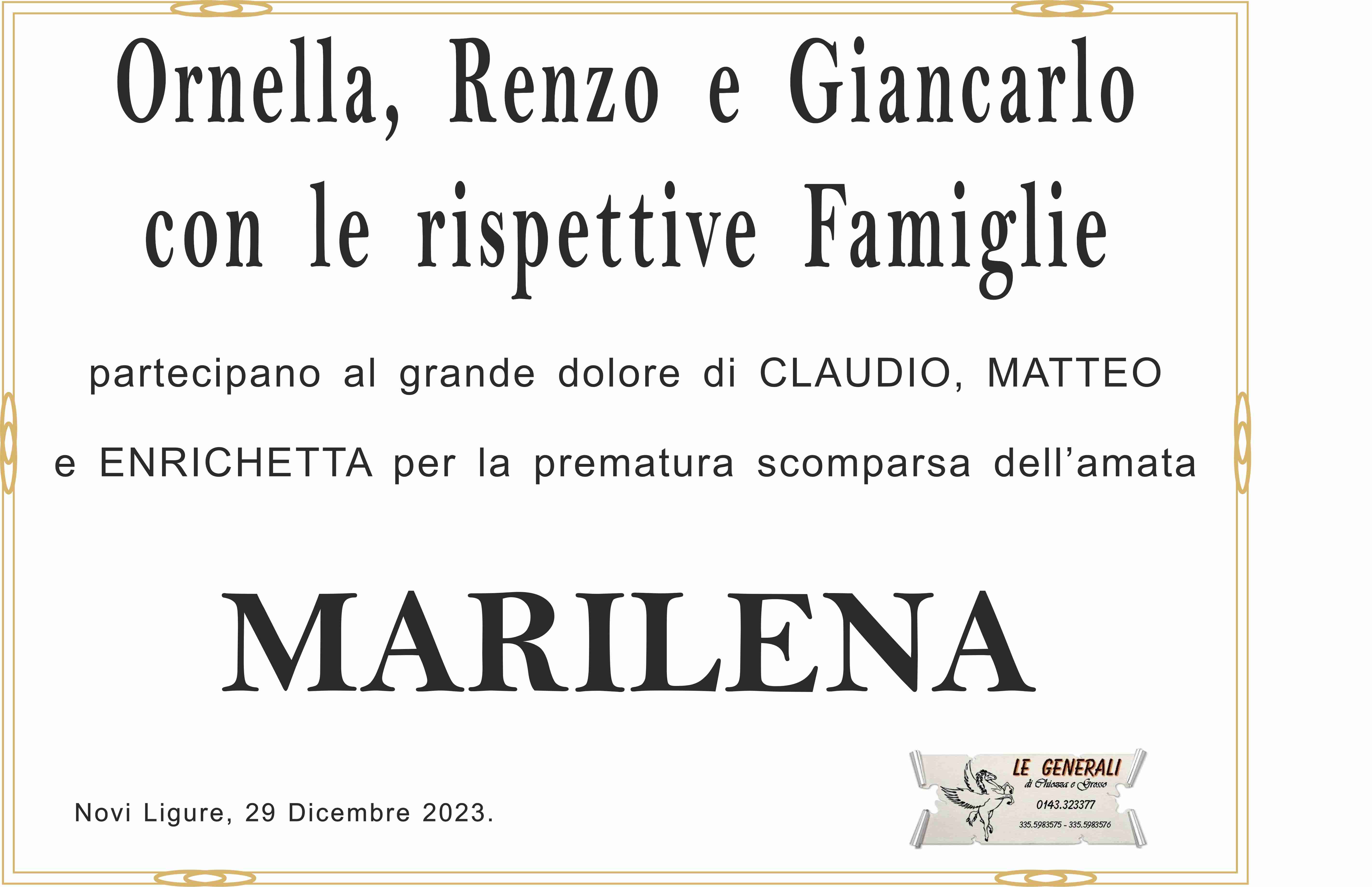 Ciao Marilena, è impossibile credere che tu non sia più con noi. Siamo cresciute e abbiamo trascorso la giovinezza insieme. La tua casa era un po' anche la mia. Mi mancherai tantissimo. Un abbraccio alla Richi, alla Renza, a Claudio e a Matteo. Mara Gemme e famiglia