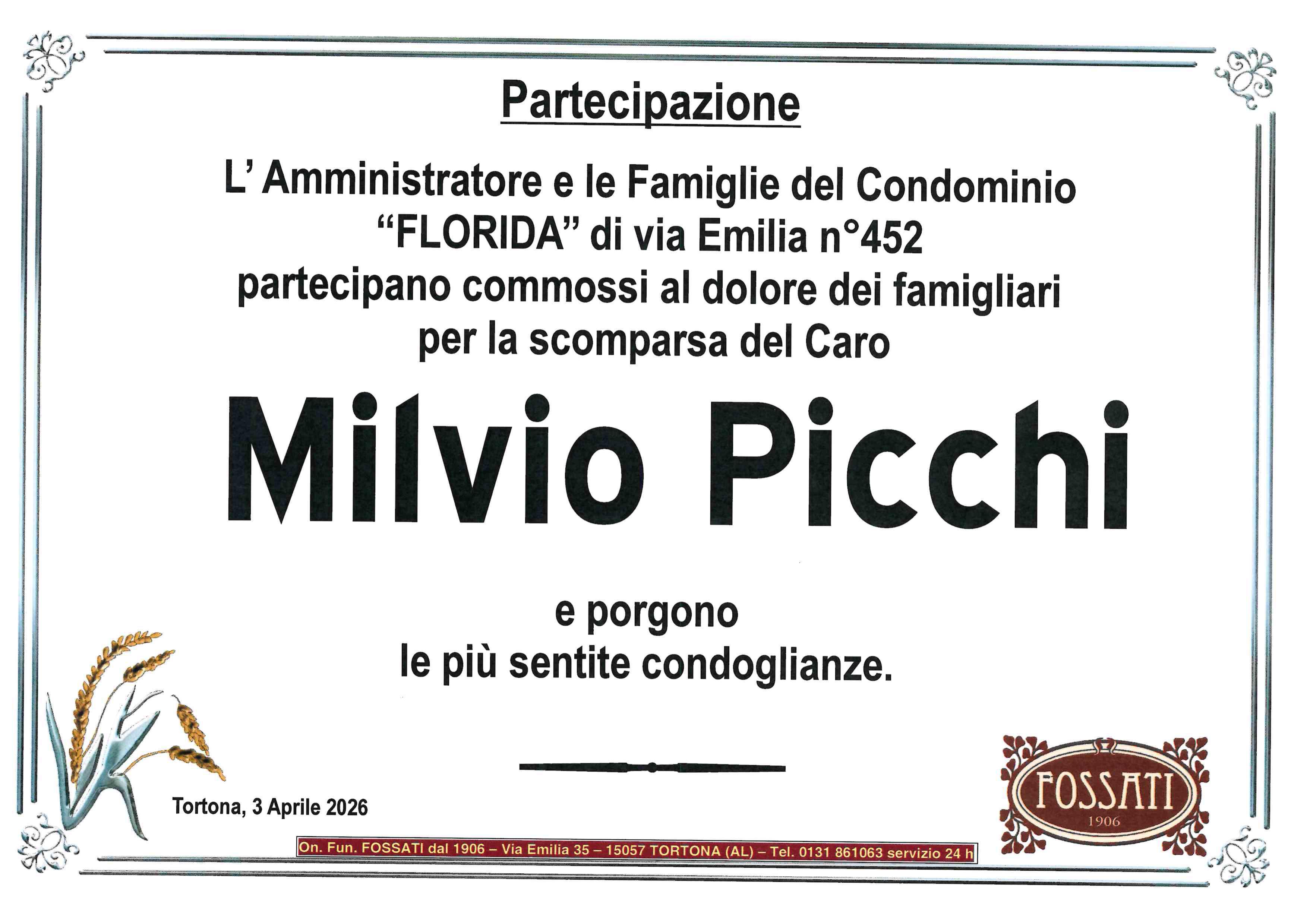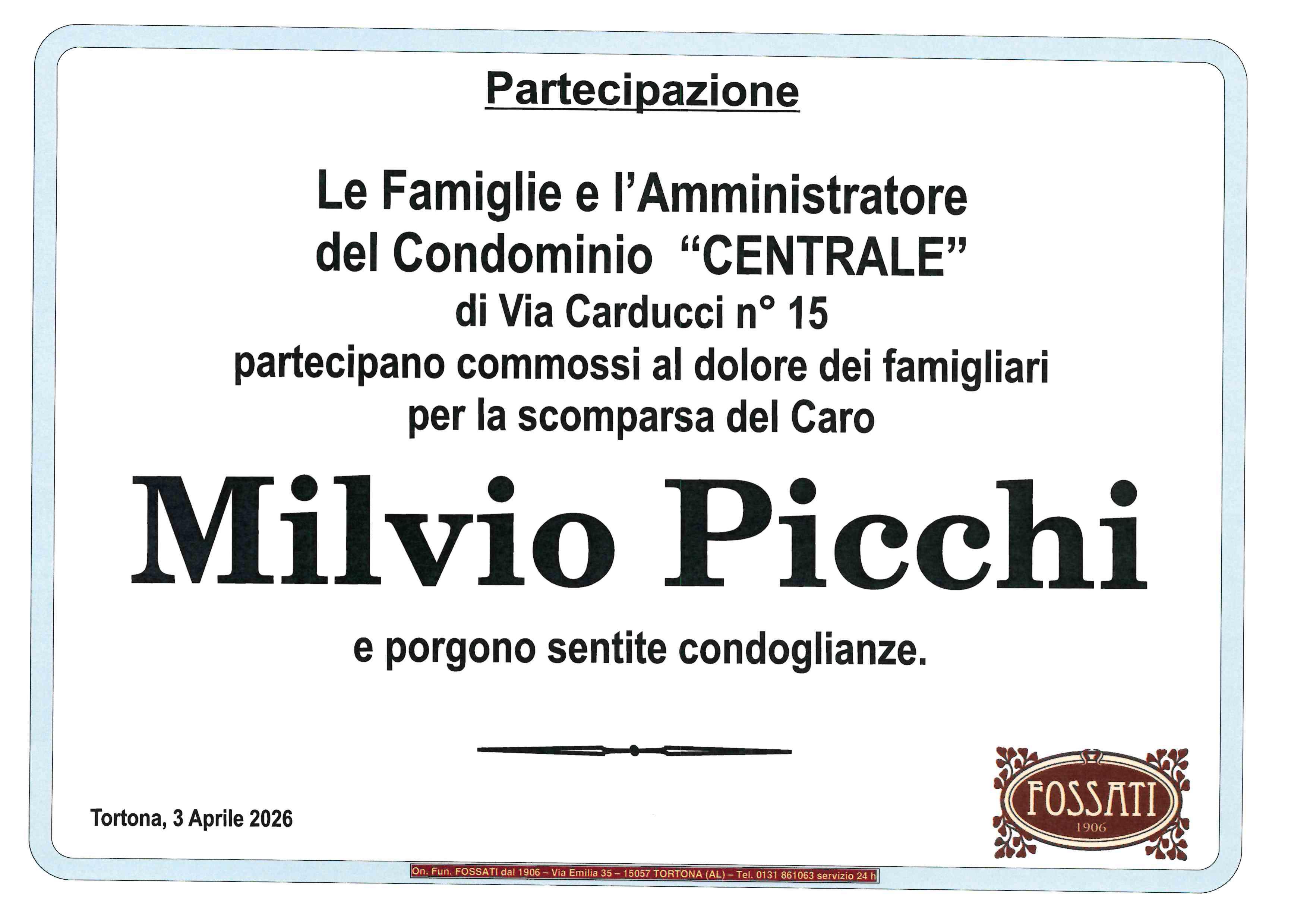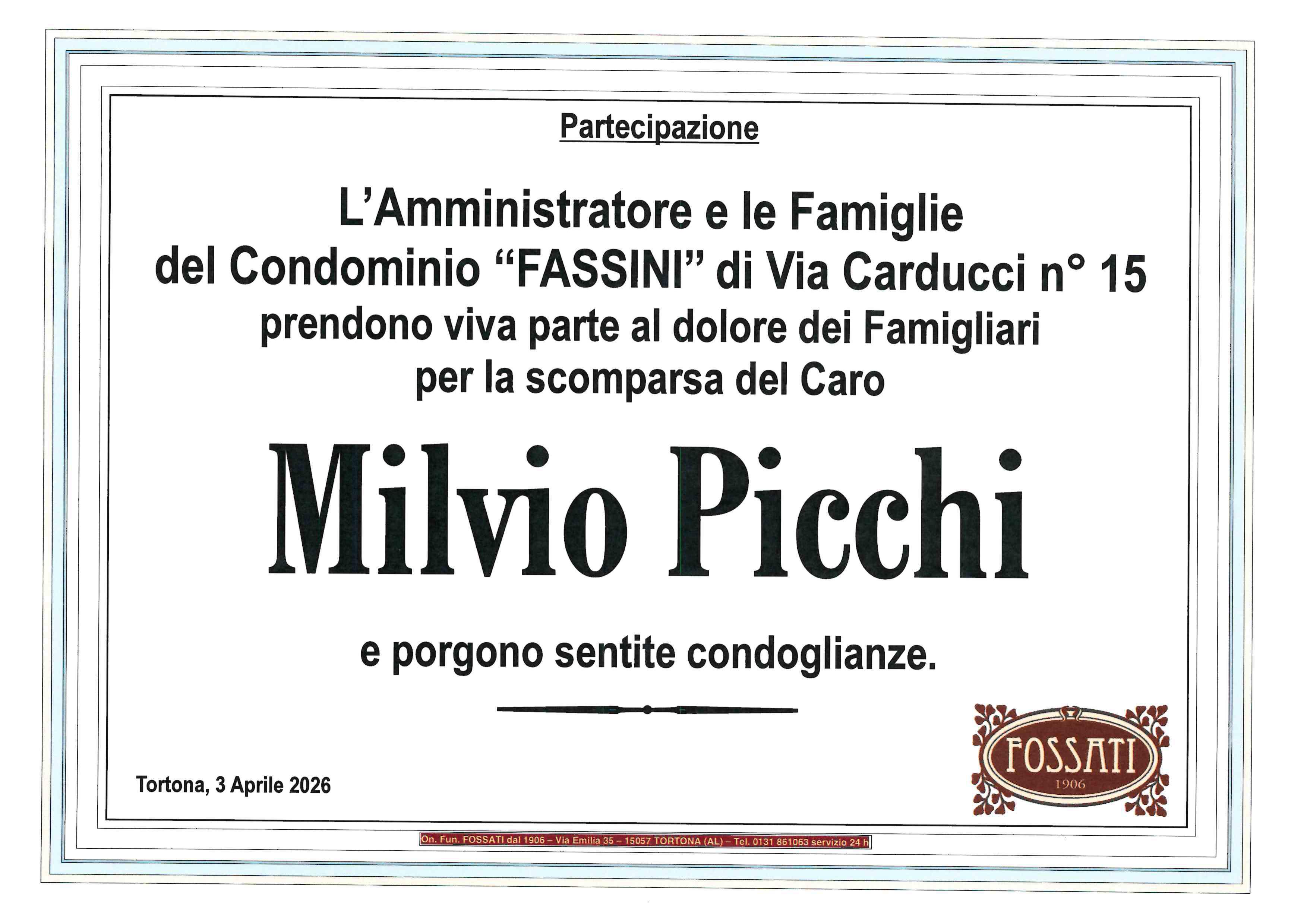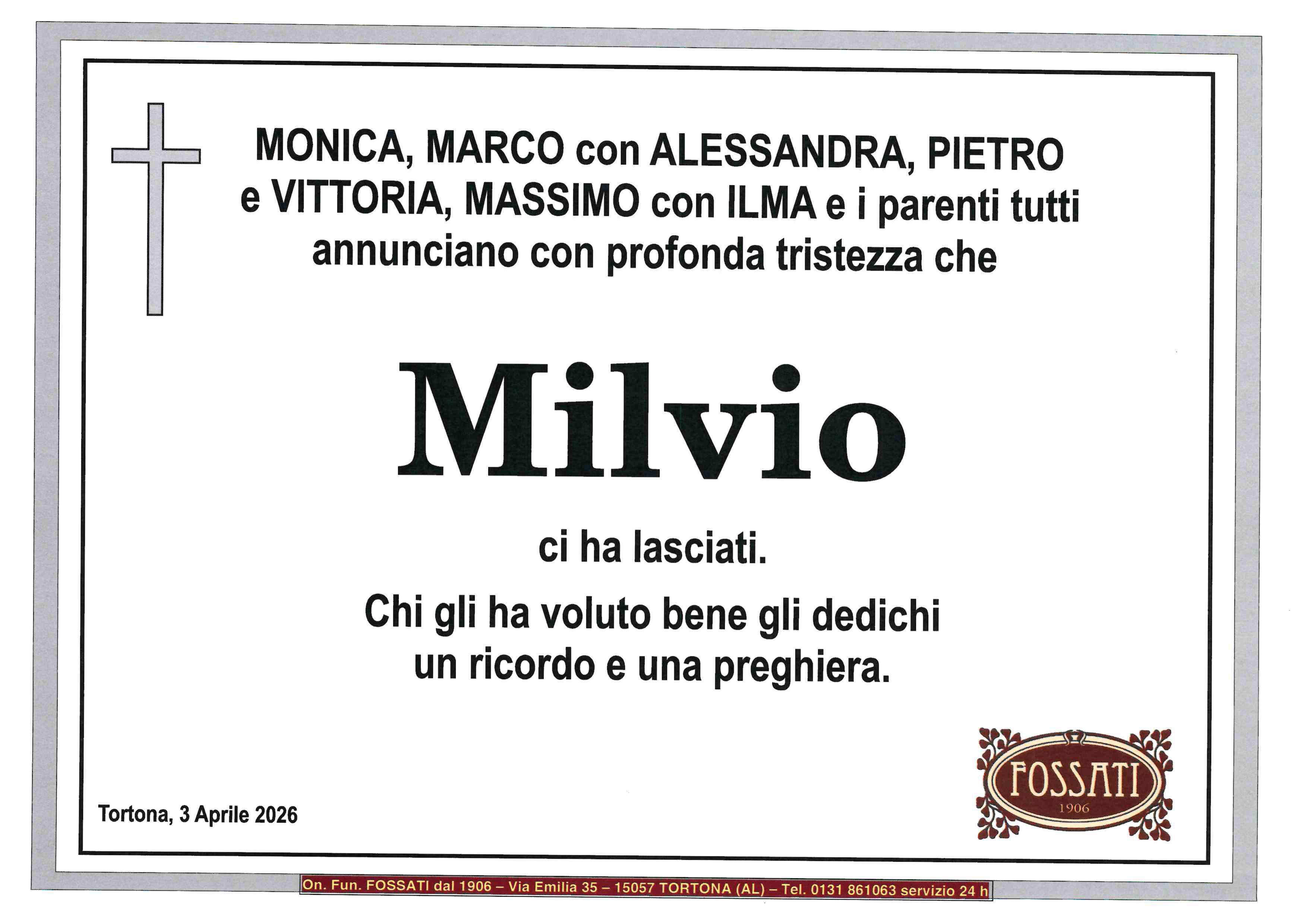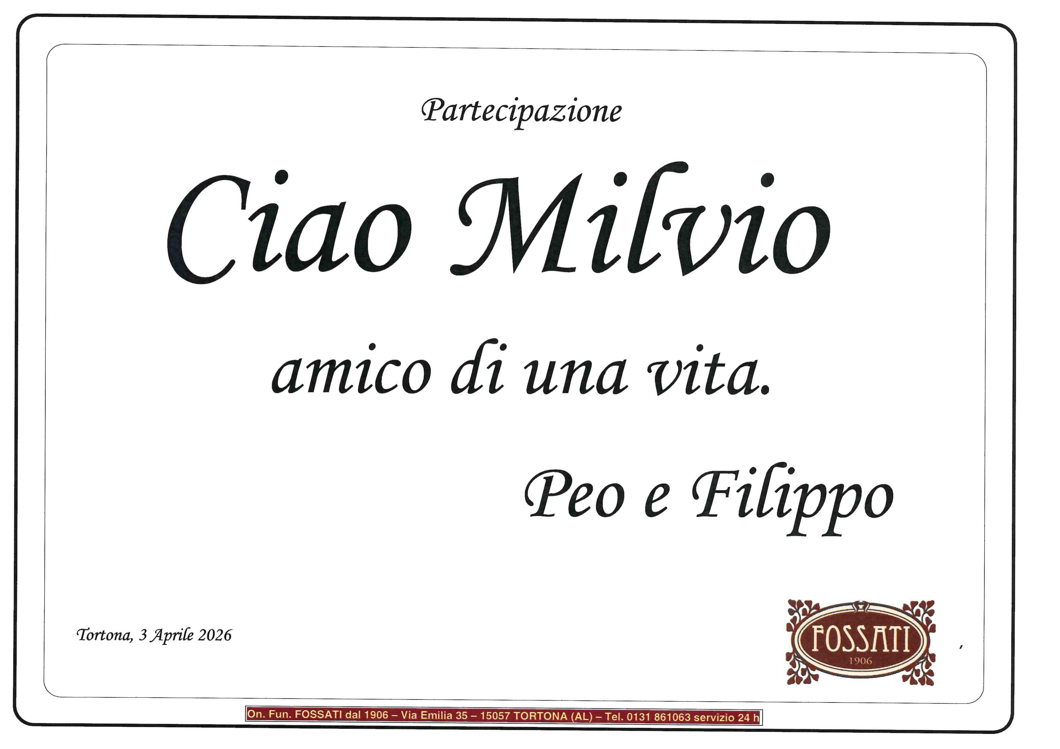 "Ciao Milvio" ci mancherà questo saluto nell' incontrarti ogni giorno. A Monica e Marco in questo doloroso momento un abbraccio e sentite condoglianze. Vittorio, Manuela, Alberto e Luigi Berago