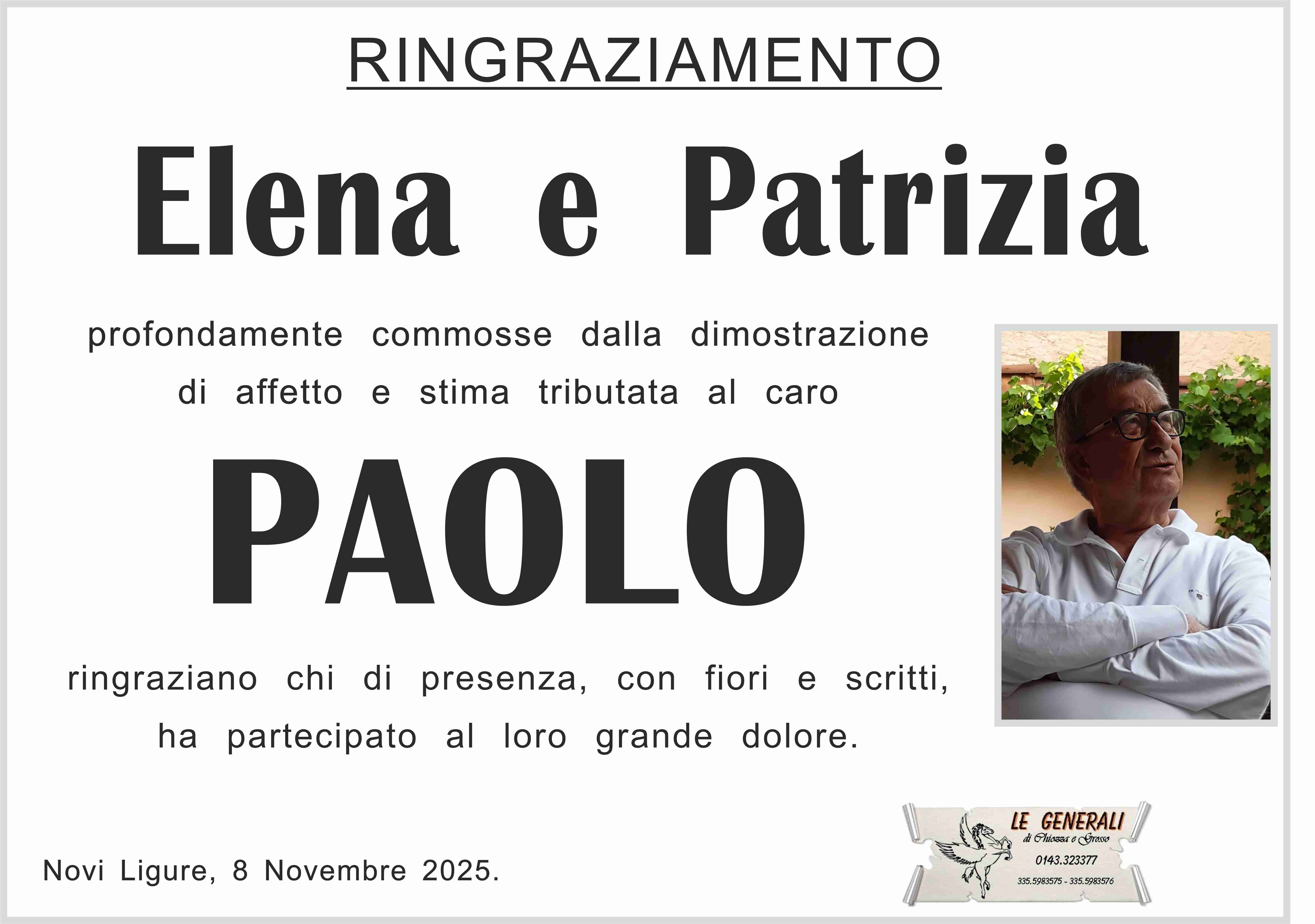 Ciao Paolo, mi mancheranno le telefonate con le quali restavamo in contatto anche se non riuscivamo a vederci. Ti ricorderò sempre con grande affetto. Mi stringo al dolore della moglie Patrizia, ad Elena con Gaia, a Piero ed ai parenti tutti.