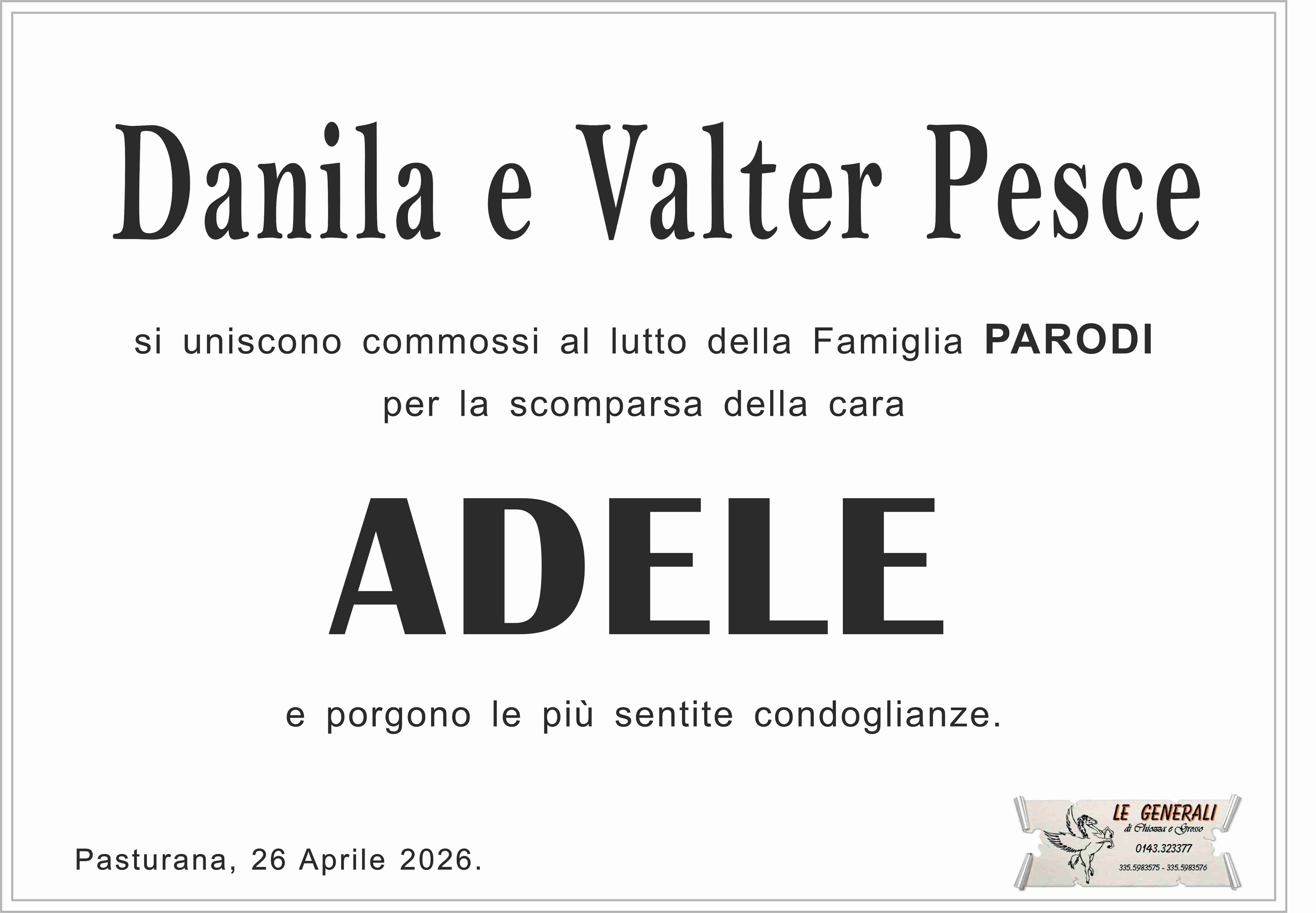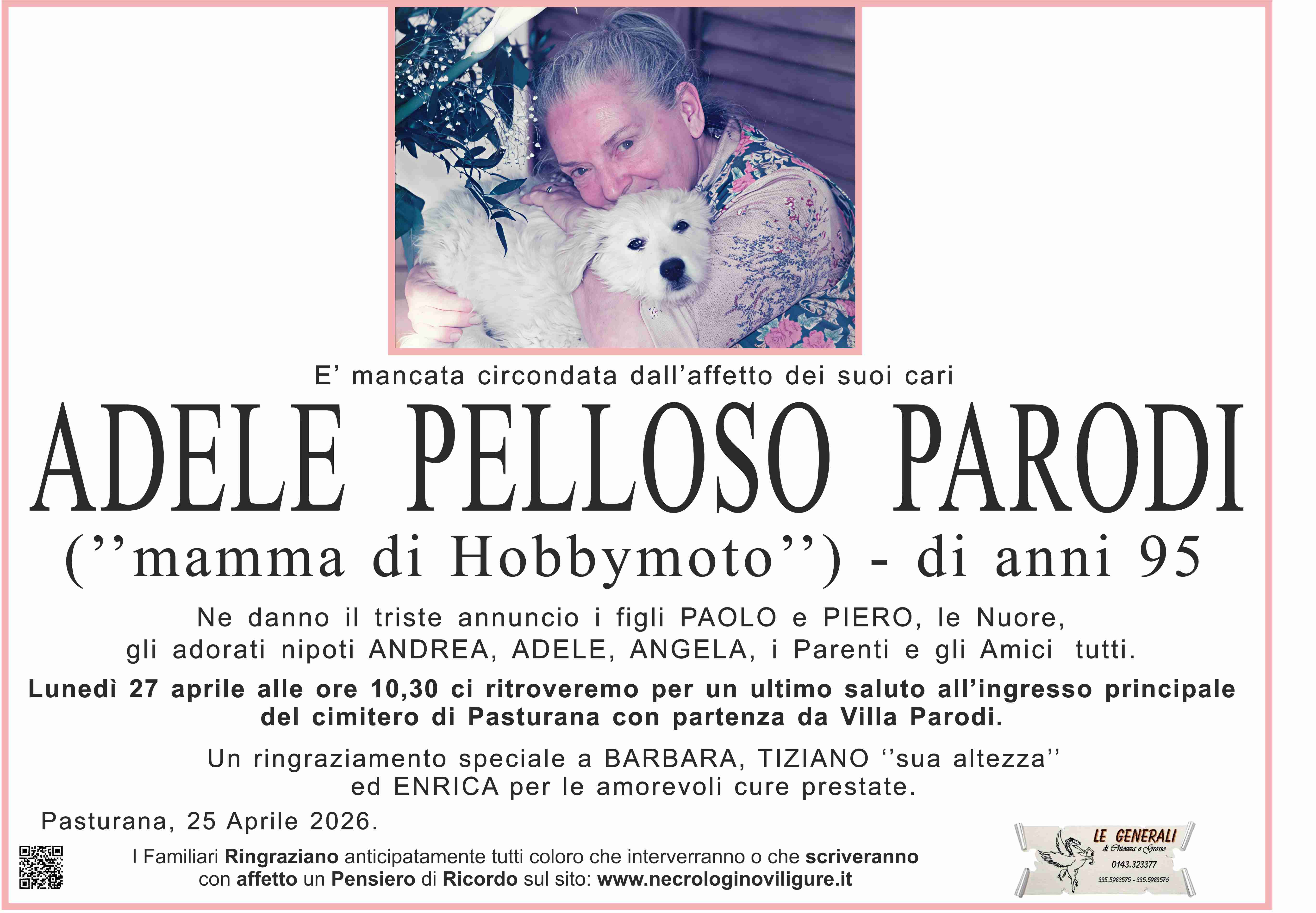 Abbiamo avuto il privilegio di conoscere Adele e di toccare con mano quella solidità e quella forza che la rendevano una presenza speciale, capace di tenere insieme persone e affetti. Per una donna dei suoi valori, nascere il primo maggio e andarsene il 25 aprile ha qualcosa di commovente e quasi perfetto. Come se avesse scelto lei la data. Un vuoto così si sente davvero. Siamo vicini a Paolo, Nadia, Piero, Andrea, Adele e Angela.