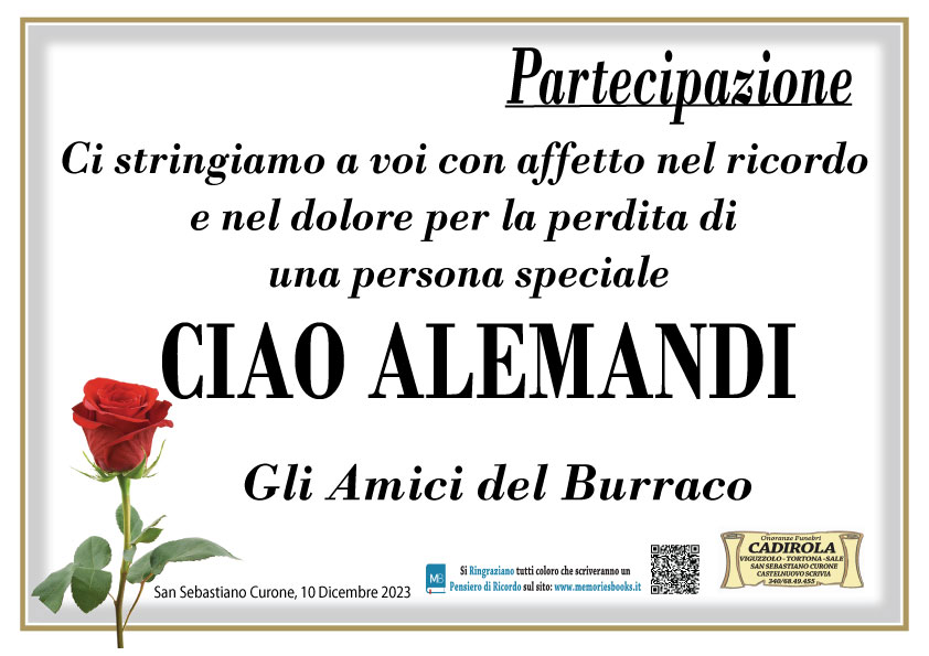 "Non piangete la sua assenza, sentitevi vicino, parlategli ancora, Vi amerà dal cielo come vi ha amati sulla terra." (Sant’Agostino). Nell'impossibilità di farlo personalmente, con una preghiera ci uniamo al dolore di Giuliana e dei figli per la scomparsa del caro Alemandi. Sentite condoglianze e un forte abbraccio.