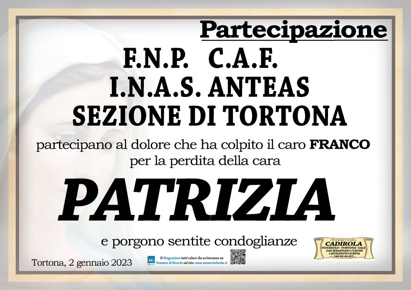 Profondamente commossa per la perdita della cara Patrizia e nell'impossibilità di provvedere personalmente, porgo le più sentite condoglianze a tutta la famiglia. Un grande abbraccio
