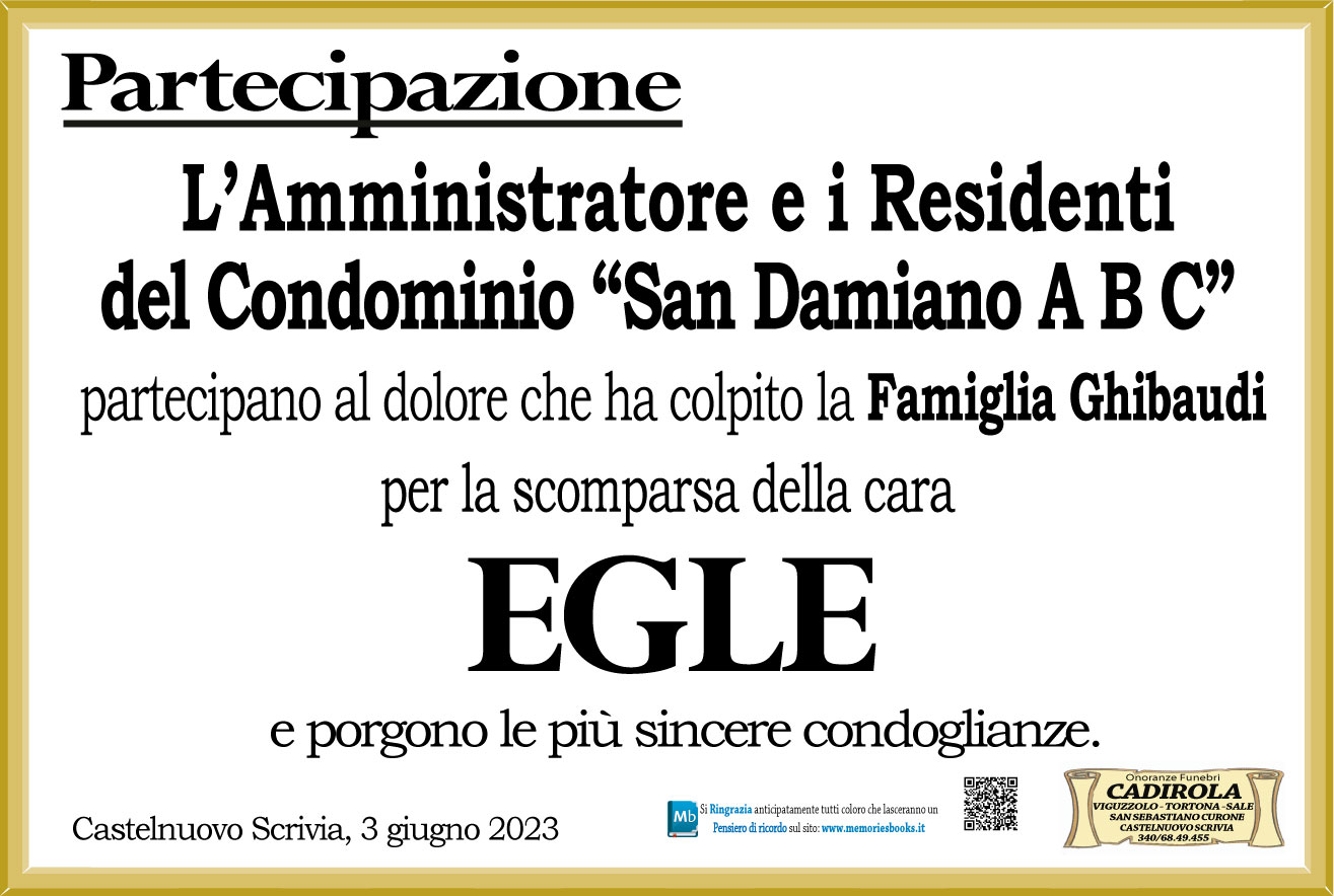 Profondamente rattristati, porgiamo sentite condoglianze alla Famiglia Ghibaudi per la scomparsa della cara Egle. Gianfranco e Maria Paola Casalinuovo.