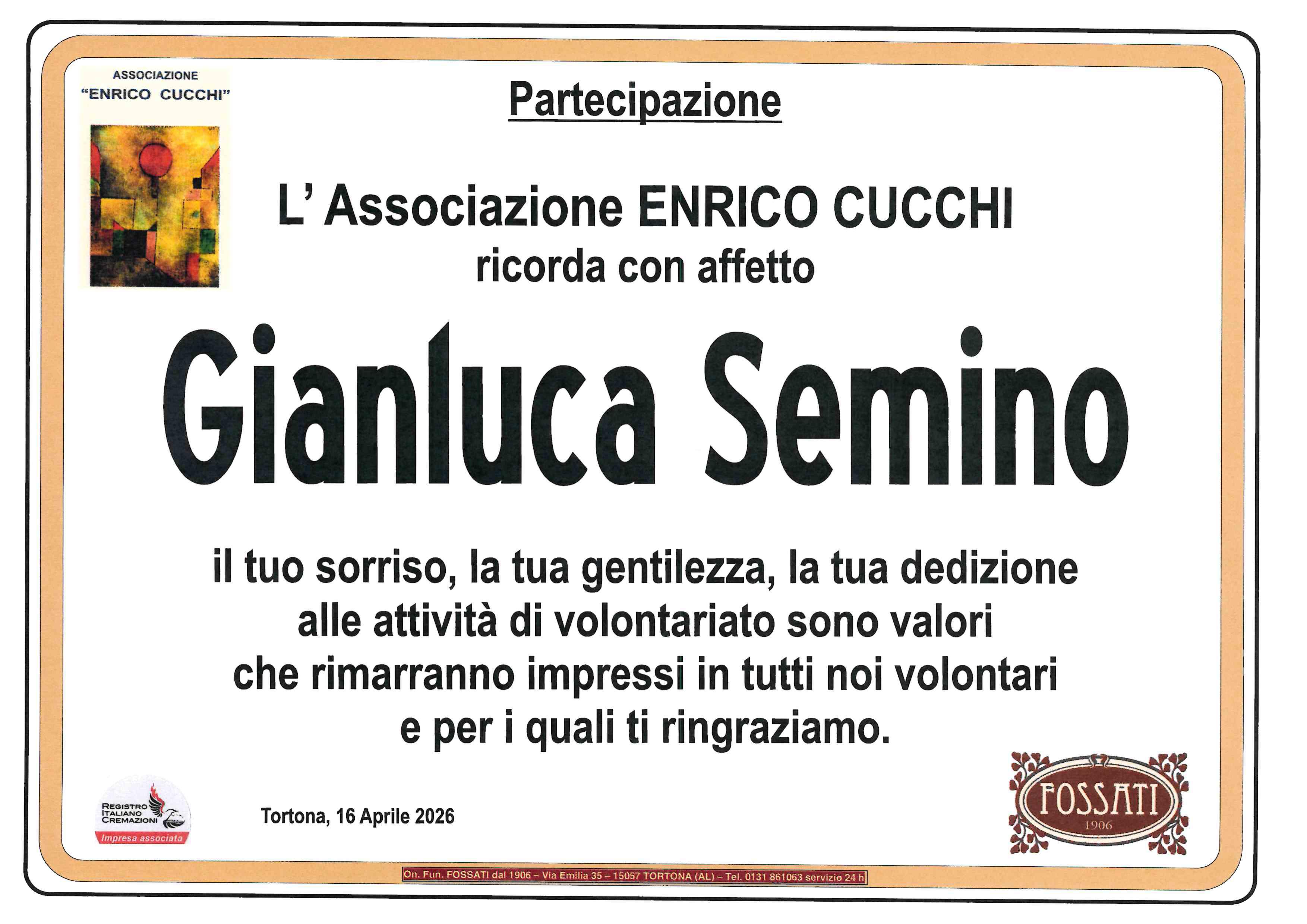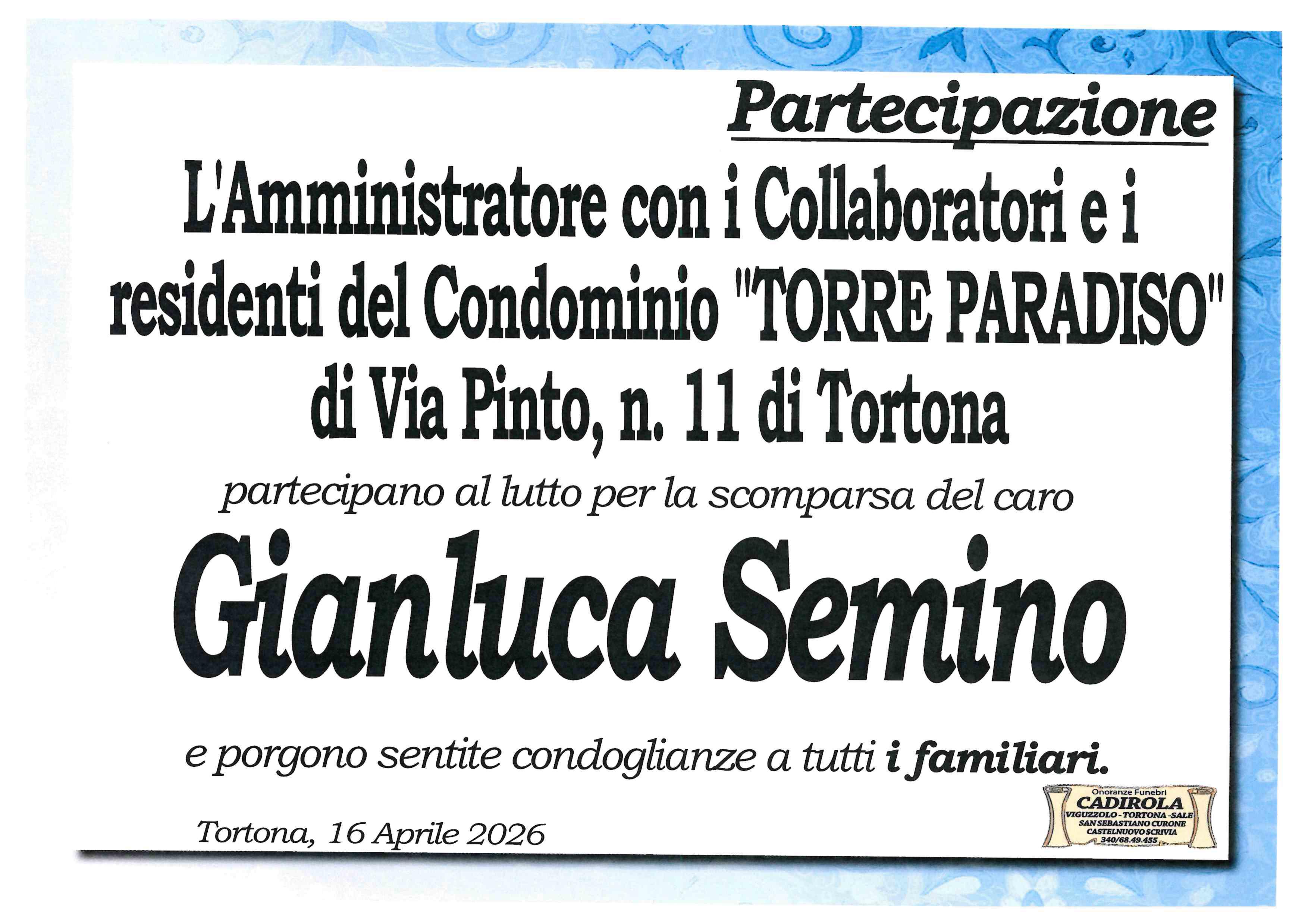 Siamo vicini ad Anna e Tutti i familiari per la perdita di Gianluca, ed esprimiamo le nostre più sentite condoglianze