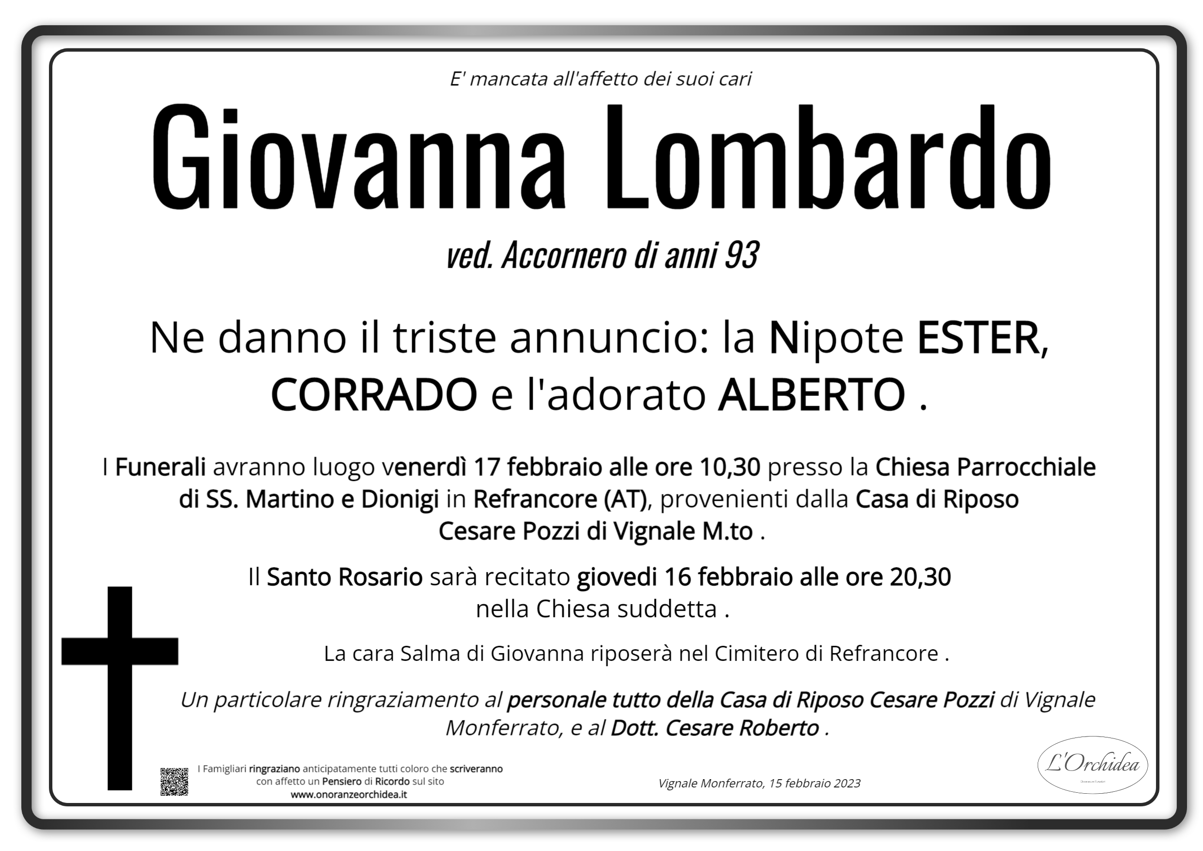 I familiari ringraziano anticipatamente tutti coloro che parteciperanno alla cerimonia funebre