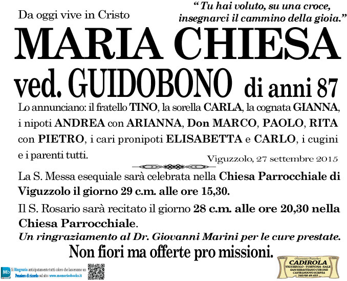 Clicca il pulsante qui sotto per visualizzare sulla mappa il luogo dove riposa MARISA CHIESA GUIDOBONO.