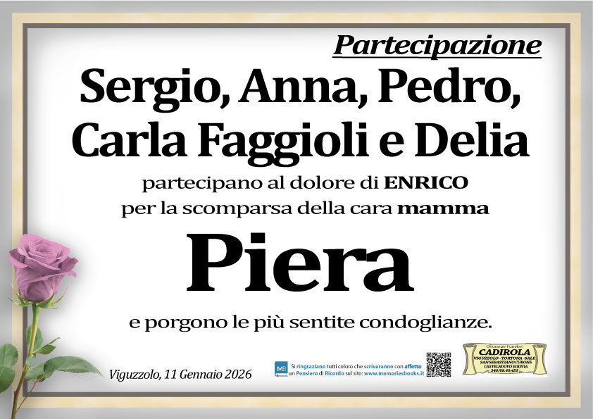Appresa la triste notizia, partecipo al tuo dolore Enrico, nel ricordo della cara Piera sempre cordiale ed affettuosa. Le mie più sentite condoglianze.