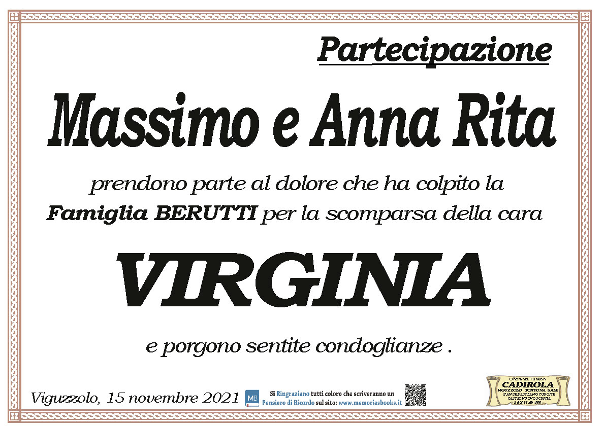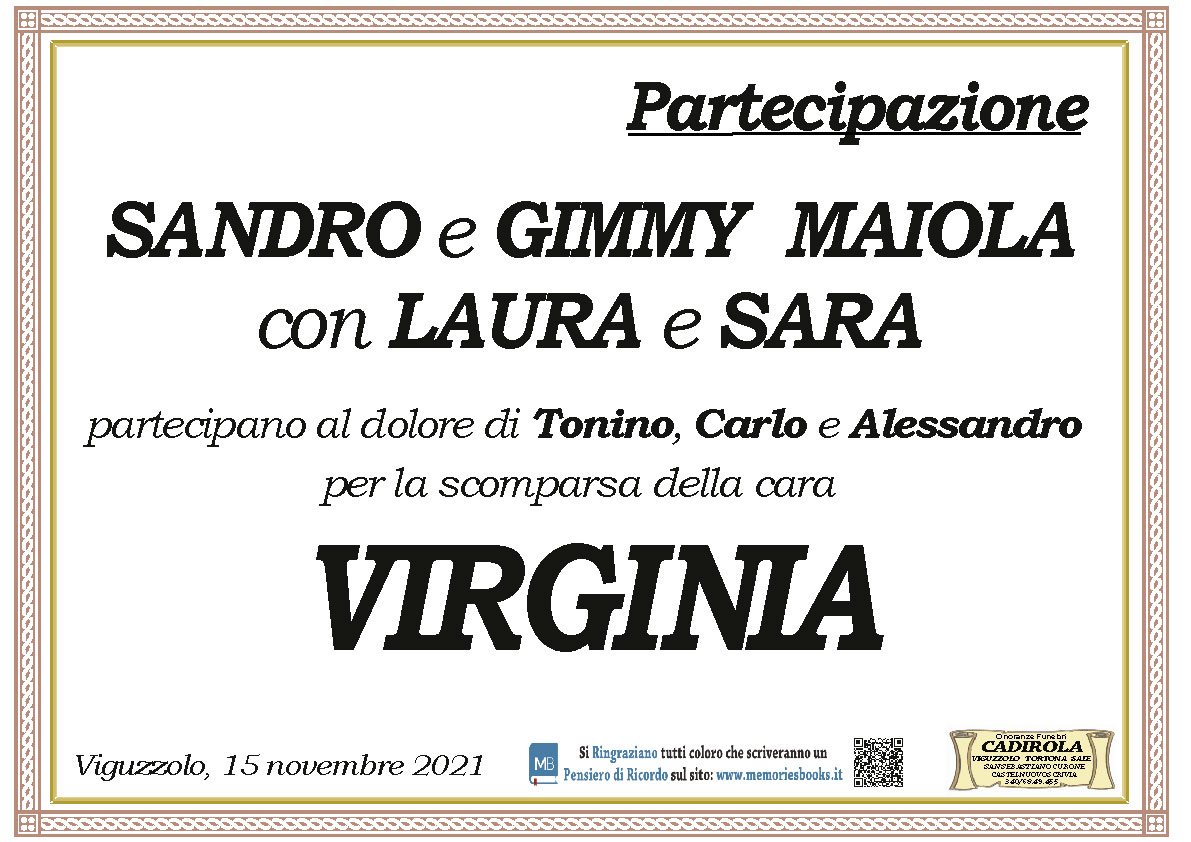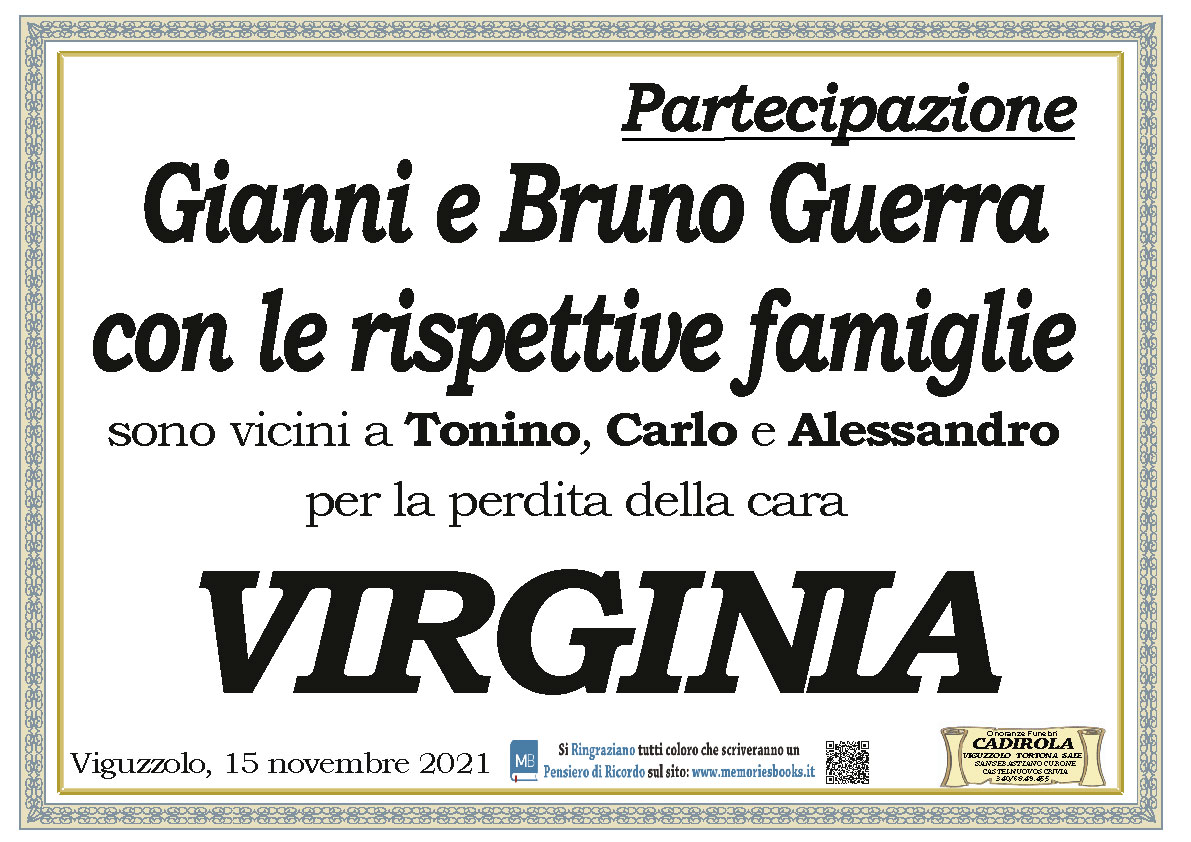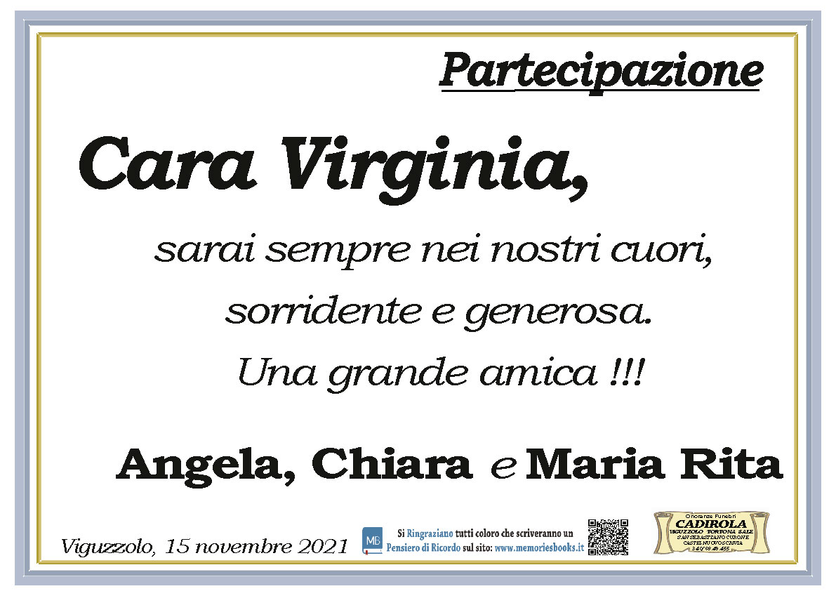 La notizia della dipartita della carissima Virginia mi addolora molto . Persona mite e buona ha dedicato la sua vita alla famiglia che oggi la piangono. Sono vicino a tutti loro ed al fratello Rino con sentimenti di vivo cordogliò. Dio l'abbia in gloria accompagnata dalla ns. preghiera in suffragio.