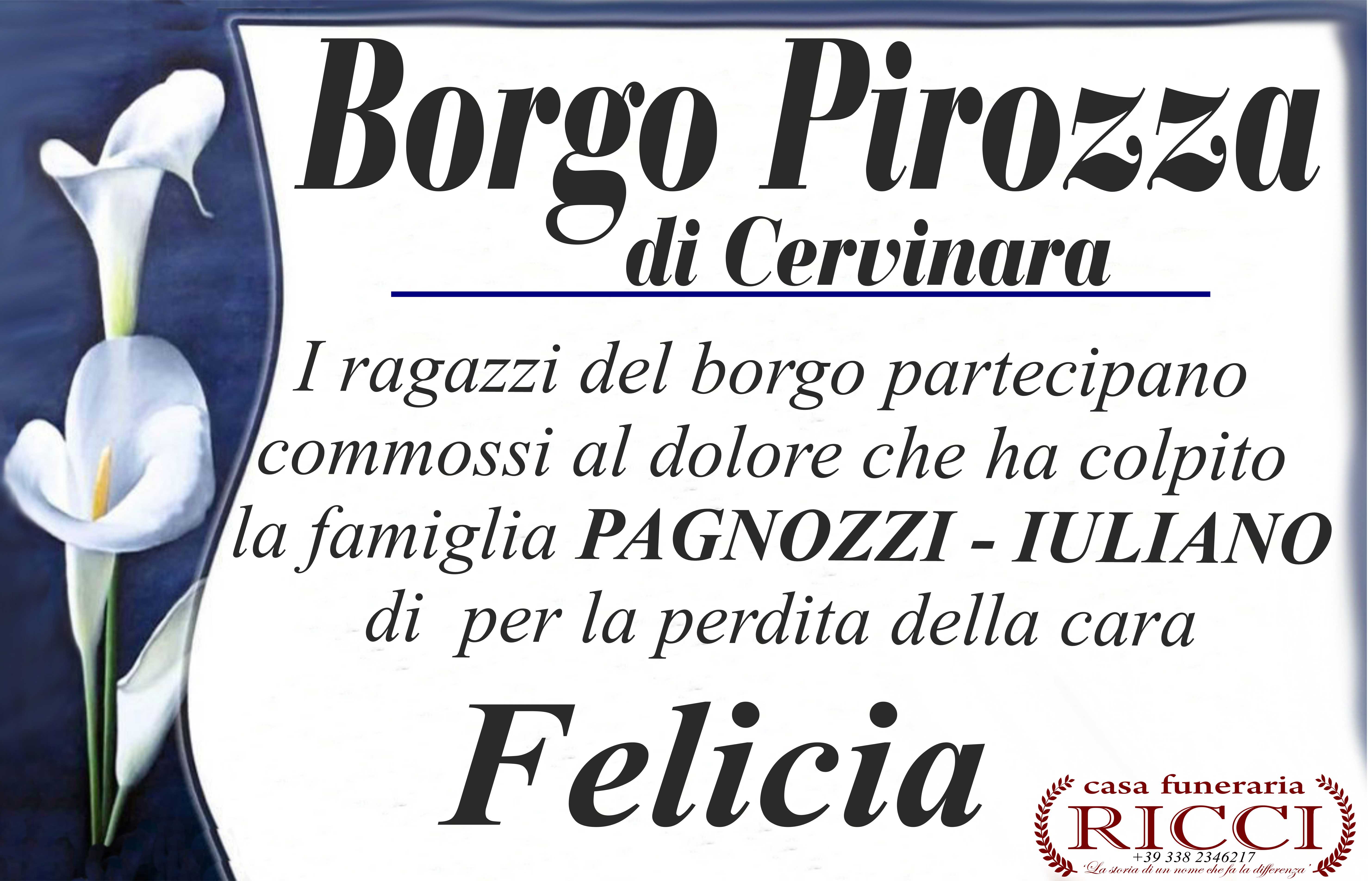 Ho appena letto la sconfortante notizia della dipartita di Felicina, ne sono profondamente addolorato era una umilissima amica e moglie del mio caro amico Pellegrino. Anche se siamo lontani il mio cuore e' vicino a voi per confortare questo tremendo dolore abbraccio forte a Francesco e Veronica ma soprattutto a Pellegrino. Che Dio la abbi in Gloria 🙏😭