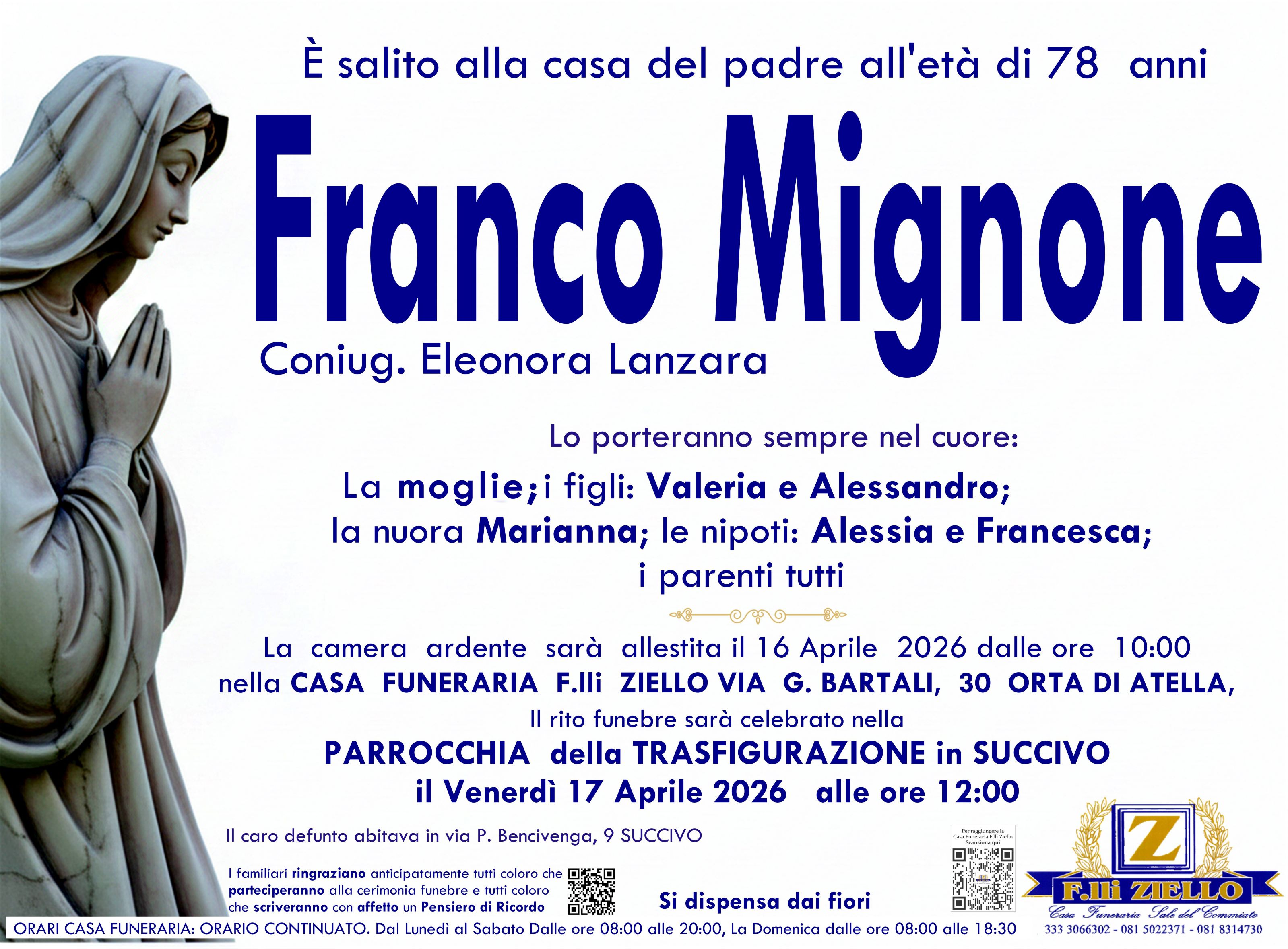 I familiari ringraziano anticipatamente tutti coloro che parteciperanno alla cerimonia funebre