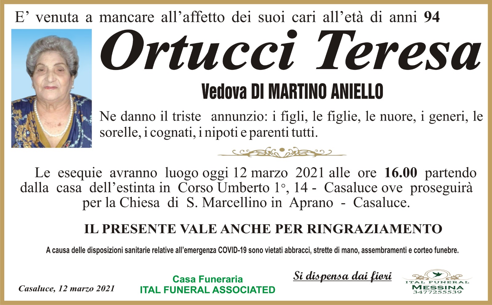 I familiari ringraziano anticipatamente tutti coloro che parteciperanno alla cerimonia funebre