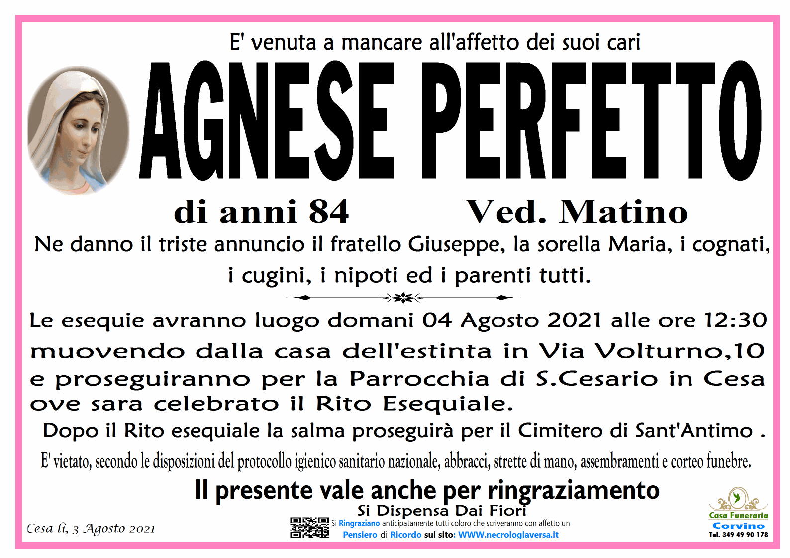 I familiari ringraziano anticipatamente tutti coloro che parteciperanno alla cerimonia funebre