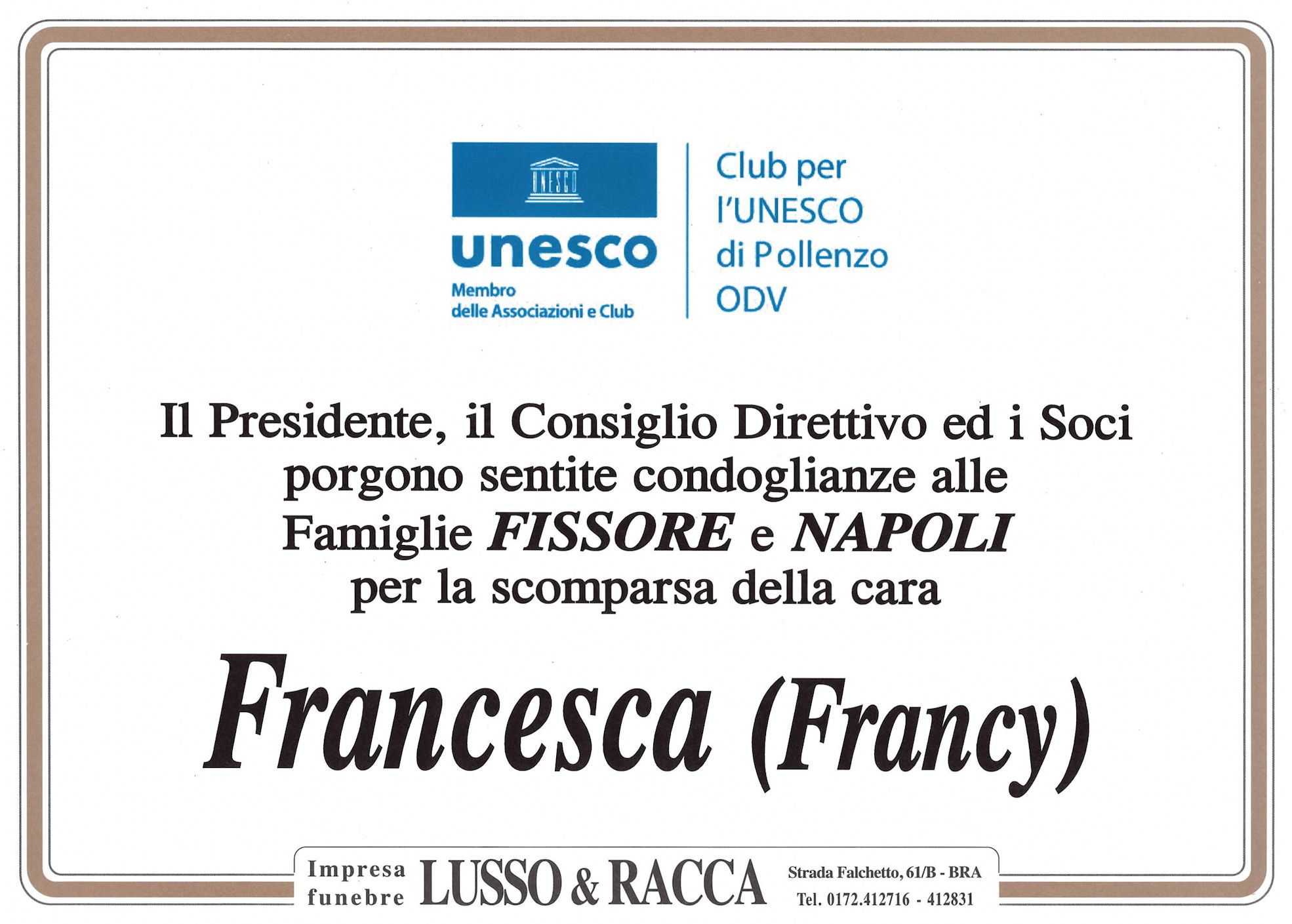 Ciao Francy, custodirò per sempre dei bei ricordi trascorsi insieme… Sei e sarai sempre nel mio cuore… Ti mando un abbraccio fortissimo e da lassù veglia su tutti noi. Con affetto, condoglianze alla famiglia.