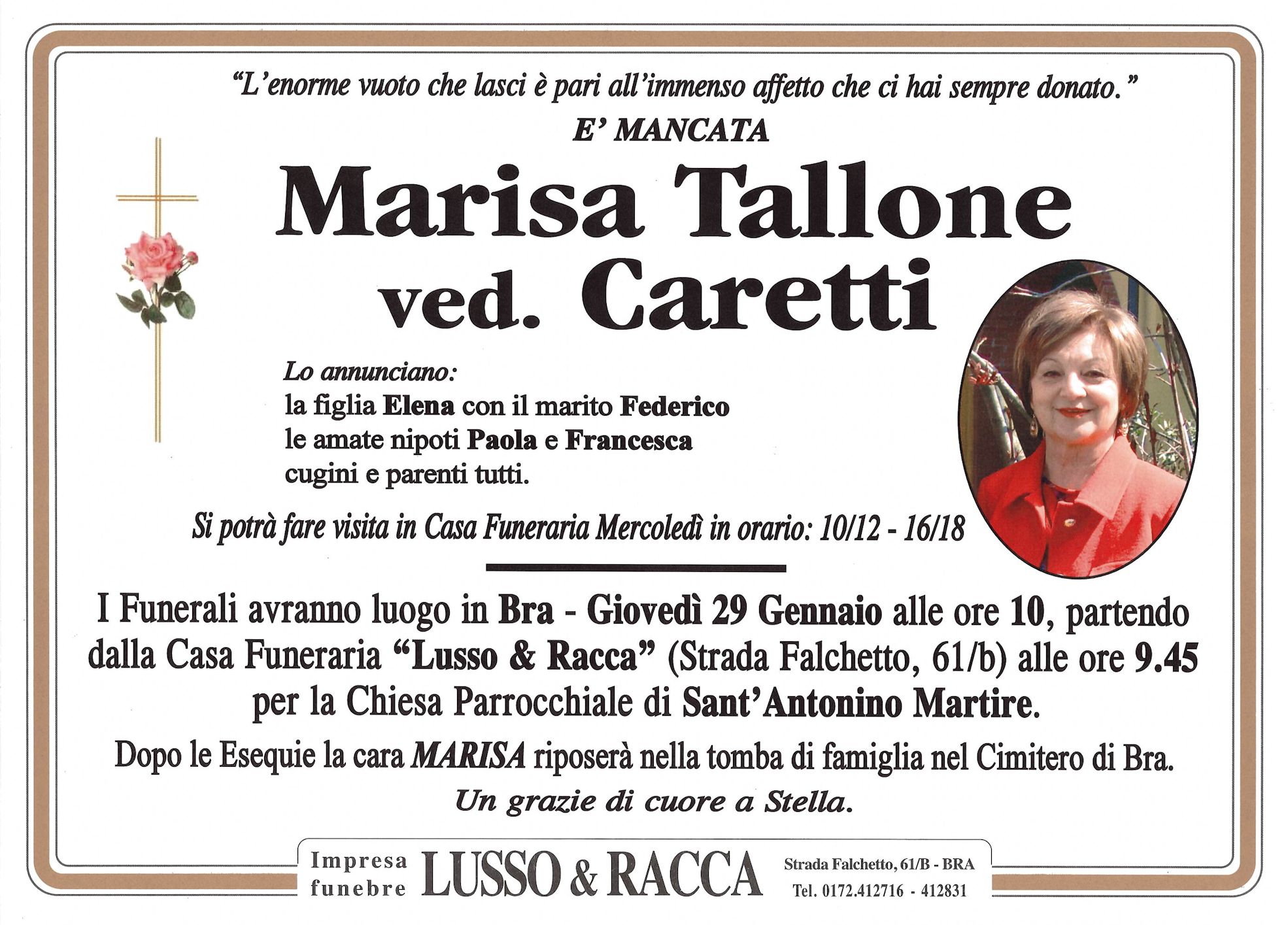 I familiari ringraziano anticipatamente tutti coloro che parteciperanno alla cerimonia funebre