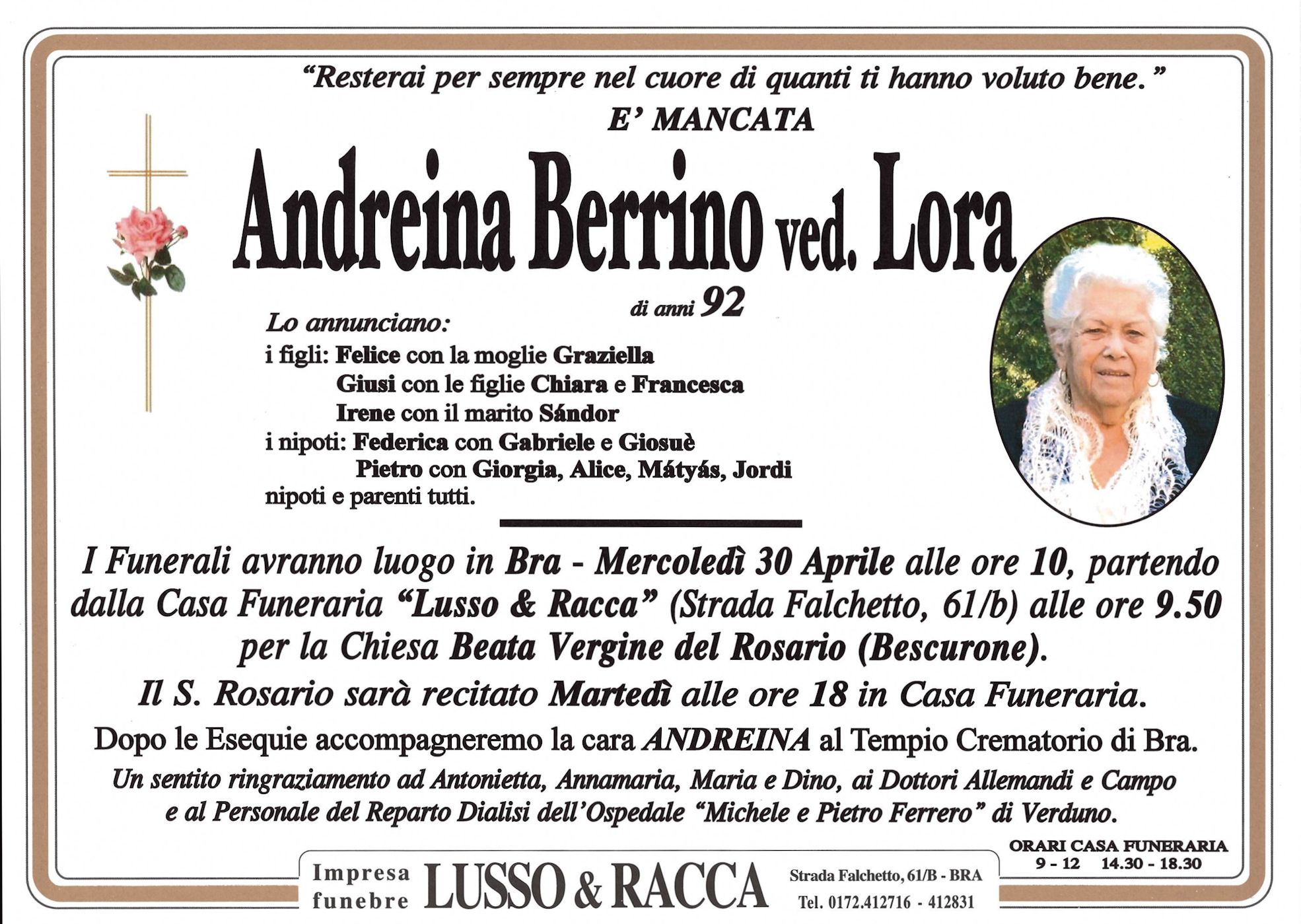 Condoglianze a tutta la famiglia per la prematura scomparsa di Andreina Berrino Ved Lora vi sono vicina con tutto il mio affetto e con le mie preghiere.... Non potrò partecipare al funerale ma all'ara Crematoria Sì.....