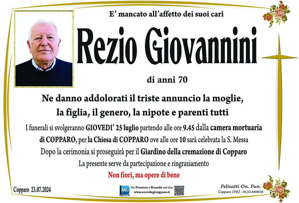 Ciao Rezio, abbiamo fatto diversi tratti di strada insieme, ci siamo conosciuti a scuola e ritrovati poi da adulti a Copparo dove la nostra amicizia si è consolidata fino a portarci a condividere piacevoli momenti comprese brevi e lunghe vacanze che non dimenticheremo. Fai buon viaggio Un grande abbraccio a Teresa e Francesca Marina e Pietro