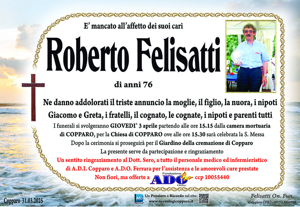 Con la tua grande umanità e professionalità hai accompagnato molti dei miei cari nel loro ultimo e più importante viaggio. Non posso dimenticare. Ci lascia una colonna portante di Copparo. Sentite condoglianze alla famiglia.