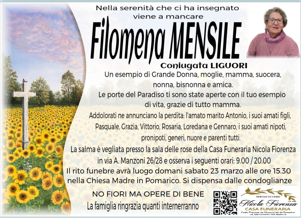 Che Il Signore accolga la signora Filomena con la stessa dolcezza con cui lei accoglieva gli amici e i parenti. Condoglianze famiglia Sannino