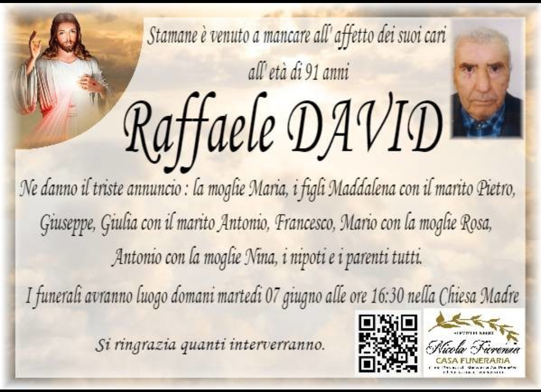 Le mie più sentite condoglianze per la scomparsa del caro Raffaele che il signore lo accolga tra le sue braccia R. I. P..