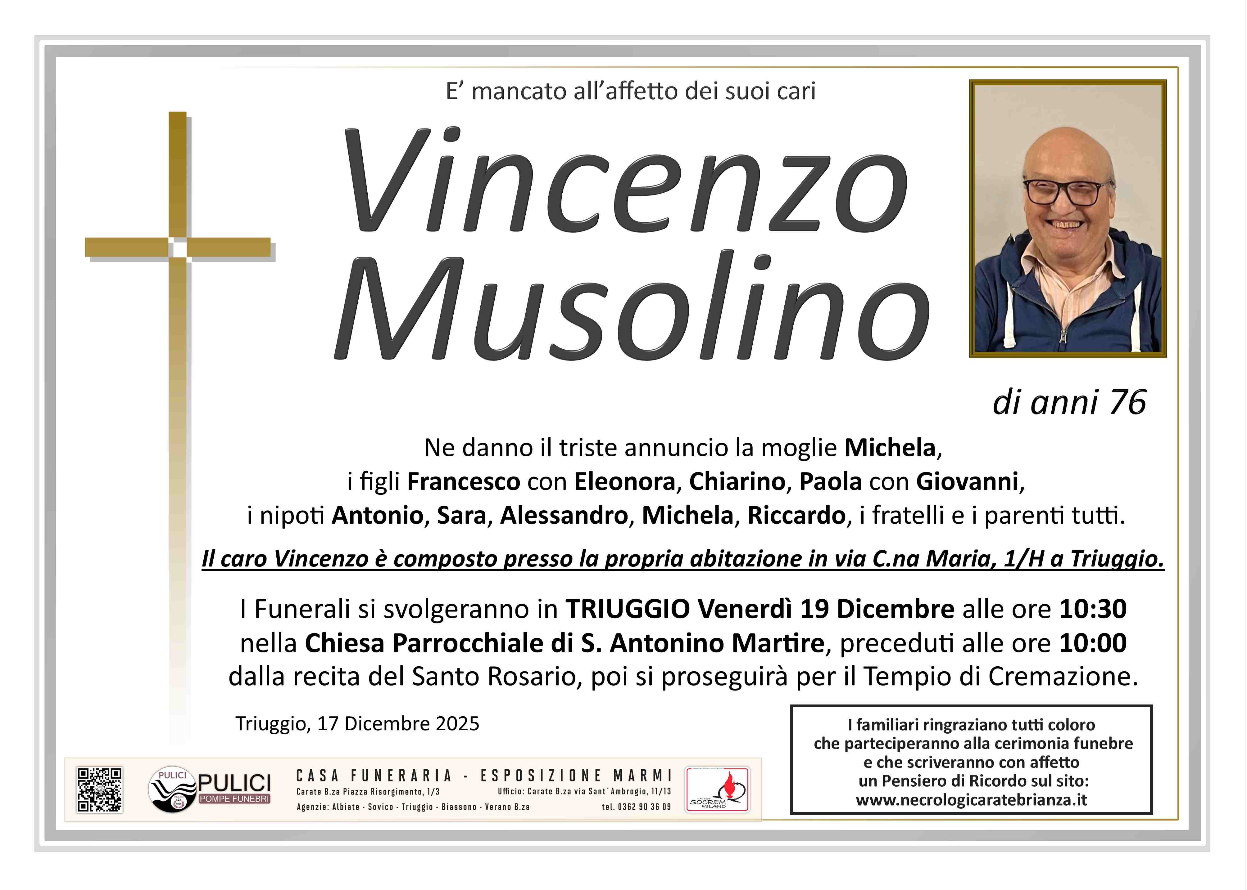 I familiari ringraziano anticipatamente tutti coloro che parteciperanno alla cerimonia funebre