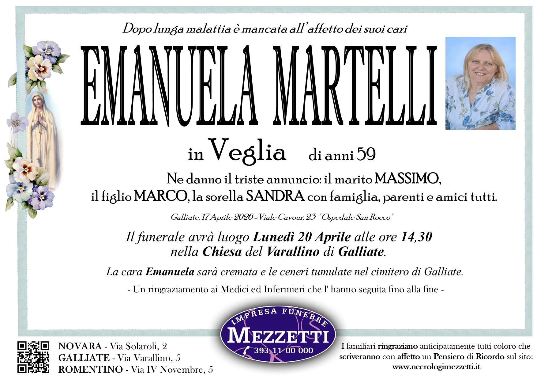 <p style="text-align:center">I familiari <strong>ringraziano</strong> anticipatamente tutti coloro che <strong>parteciperanno</strong> alla cerimonia funebre<br /> e tutti coloro che <strong>scriveranno</strong> con <strong>affetto</strong> un <strong>Pensiero di Ricordo</strong>.</p>
