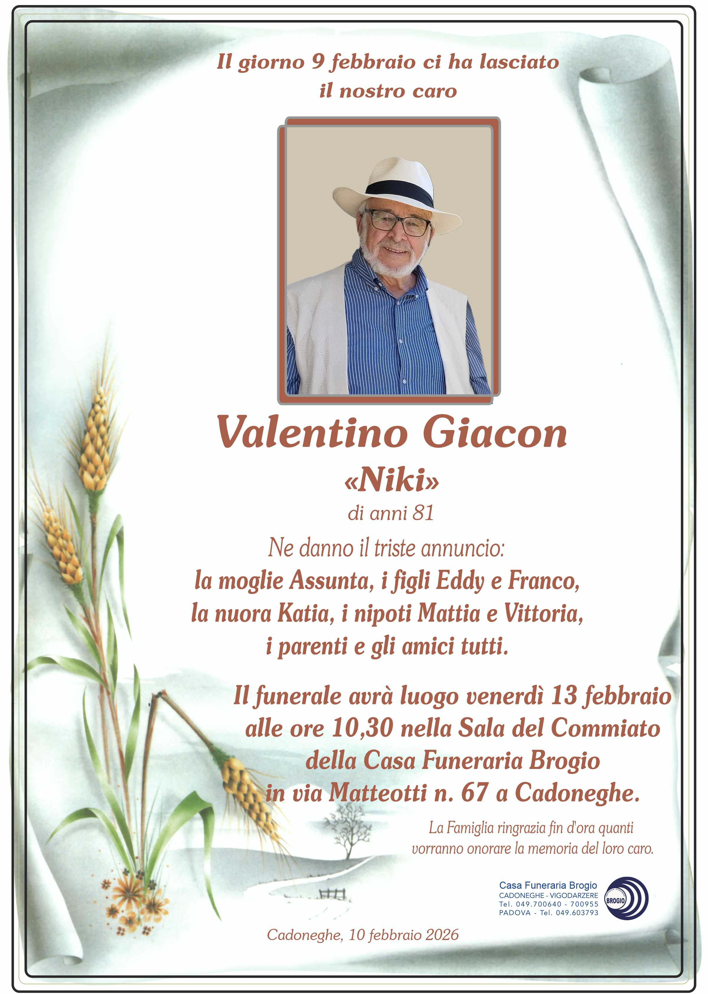 Sentite condoglianze alla vostra famiglia per la perdita del vostro caro Valentino . Famiglia Bicciato Andrea e Ornella.