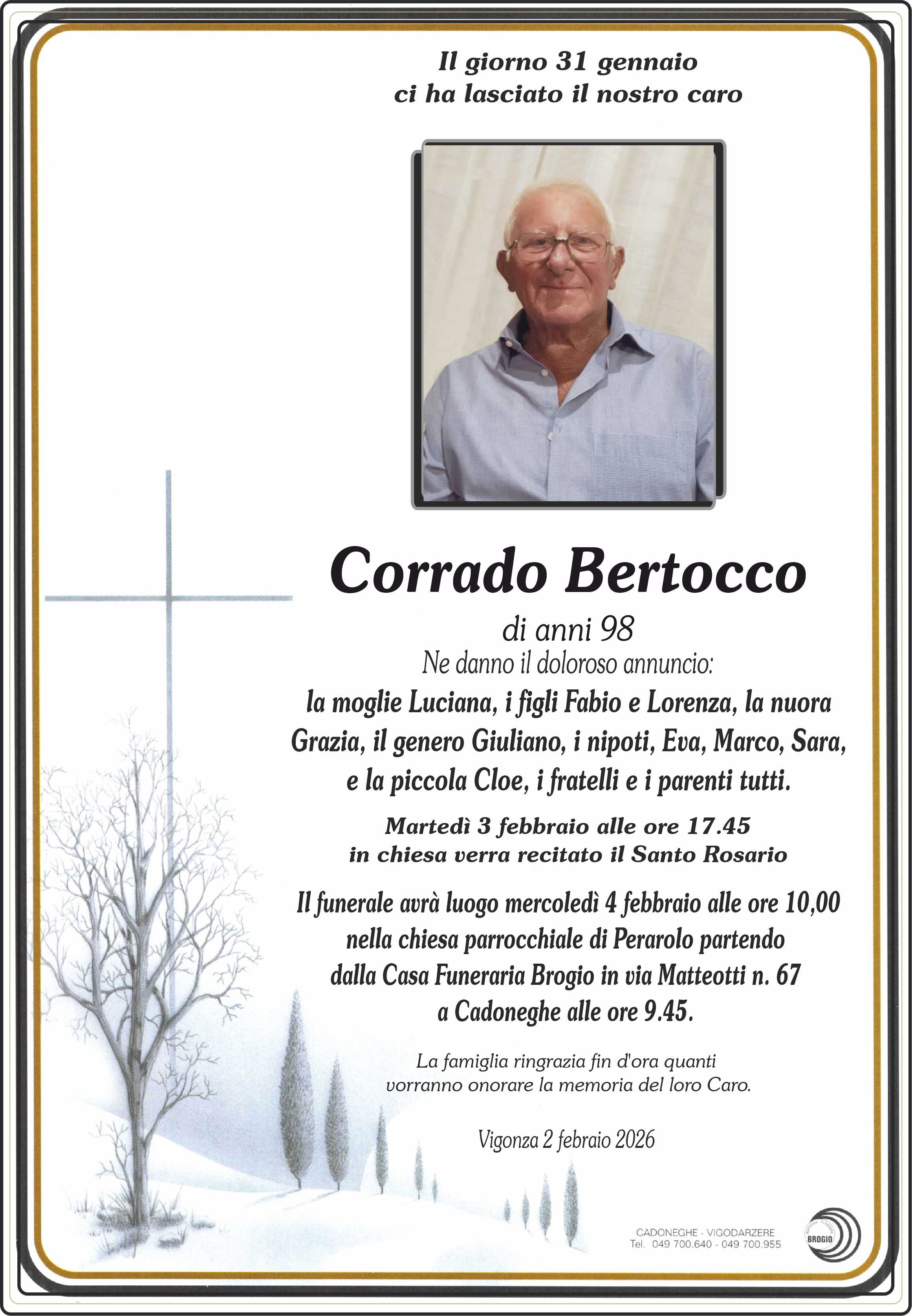 le mie piu' sentite condoglianze a tutta la famiglia Bertocco per la perdita del caro Corrado persona di grandi valori umani
