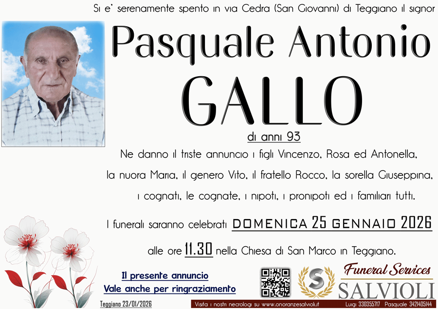 I familiari ringraziano anticipatamente tutti coloro che parteciperanno alla cerimonia funebre