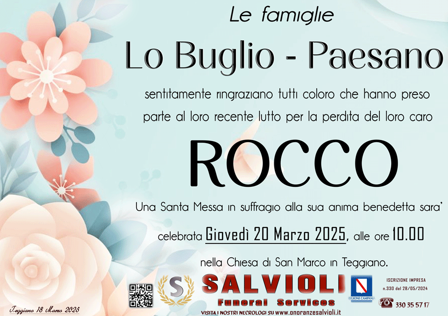 Ci uniamo con commozione e affetto al dolore che ha colpito la famiglia Paesano-Lo Buglio, per la dipartita del Caro Rocco