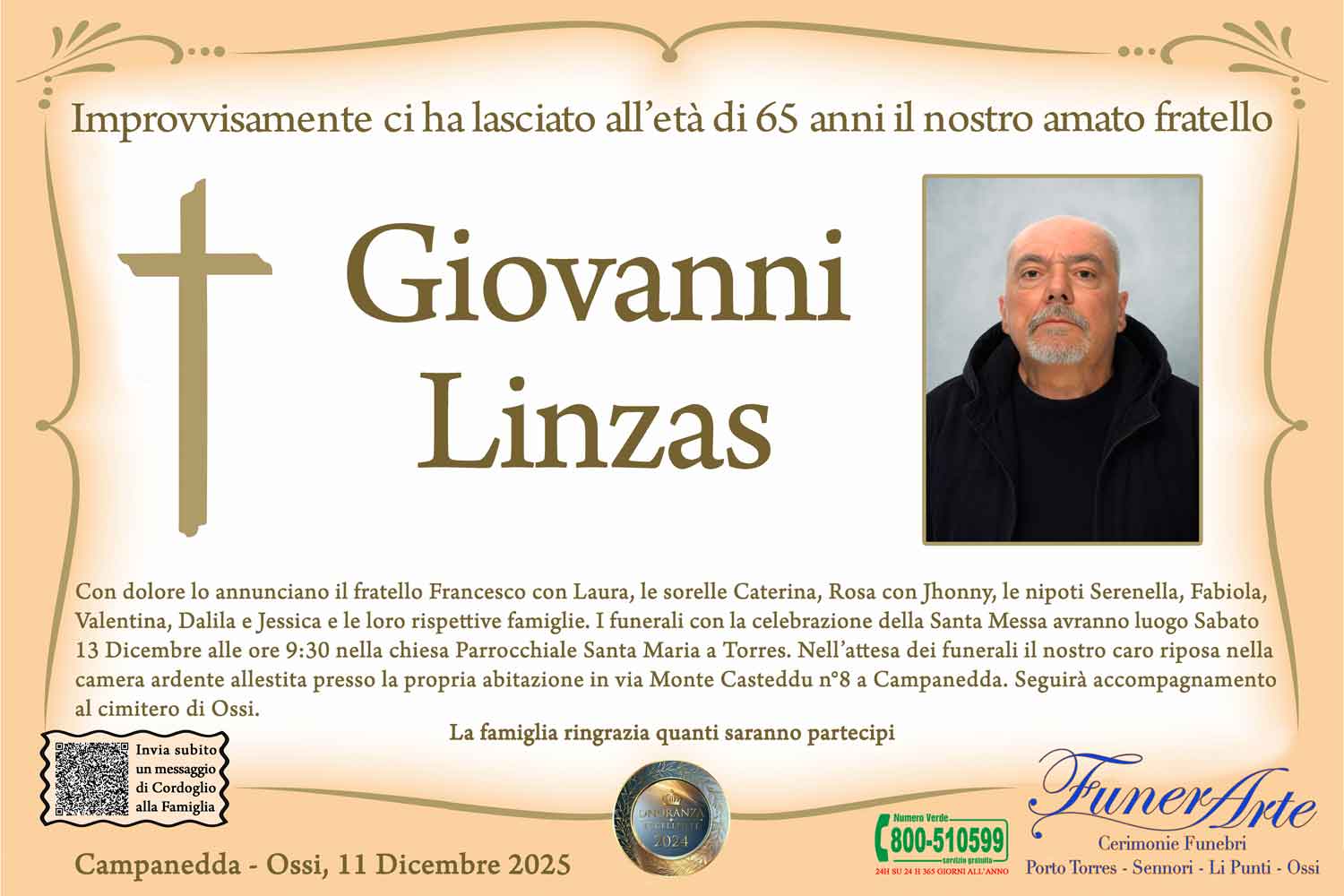Con dolore lo annunciano il fratello Francesco con Laura, le sorelle Caterina, Rosa con Jhonny, le nipoti Serenella, Fabiola, Valentina, Dalila e Jessica e le loro rispettive famiglie. I funerali con la celebrazione della Santa Messa avranno luogo Sabato 13 Dicembre alle ore 9:30 nella chiesa Parrocchiale Santa Maria a Torres. Nell’attesa dei funerali il nostro caro riposa nella camera ardente allestita presso la propria abitazione in via Monte Casteddu n°8 a Campanedda. Seguirà accompagnamento al cimitero di Ossi.