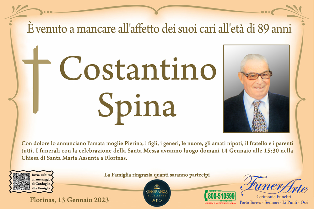 Con dolore lo annunciano l'amata moglie Pierina, i figli, i generi, le nuore, gli amati nipoti, il fratello e i parenti tutti. I funerali con la celebrazione della Santa Messa avranno luogo domani 14 Gennaio alle 15:30 nella Chiesa di Santa Maria Assunta a Florinas.