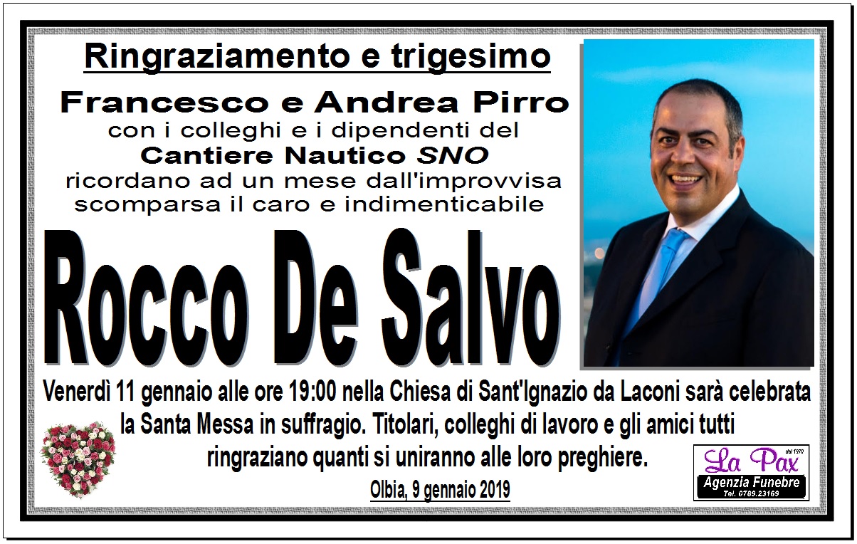 Una domenica come tante hai deciso di andartene via in silenzio in punta di piedi senza disturbare nessuno, lasciando a tutti un grande vuoto, non ci sono parole per spiegarlo. La tua bontà le tue risate, l'onestà e l'amore per il tuo lavoro erano la tua vita e i tuoi ideali. Chi ti ha conosciuto ti ha voluto bene e chi ti ha voluto bene ti piange. Ovunque tu sia veglia sempre su di noi perché i fiori appassiscono le lacrime si asciugano ma la tristezza nell'anima non andrà mai via. Ci mancherai tanto Rocco. Questo pensiero e per te che hai lasciato in tutte noi qualcosa che niente e nessuno potrà mai cancellare perché certi legami vanno oltre tutto e tutti.