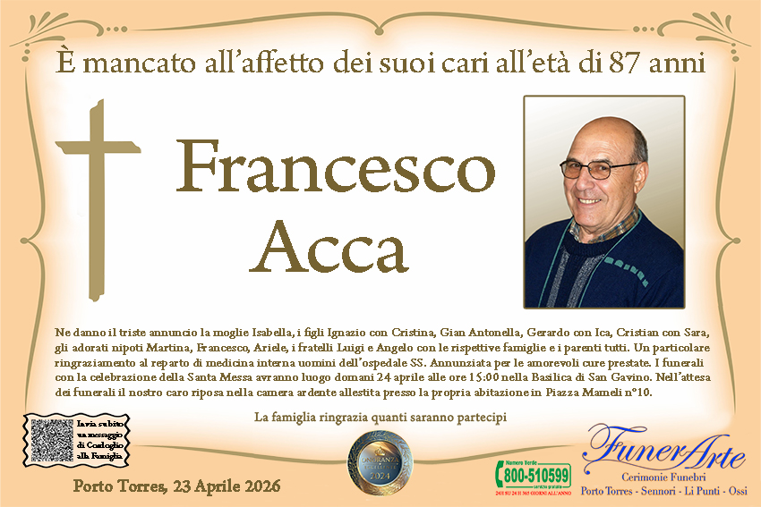Ne danno il triste annuncio la moglie Isabella, i figli Ignazio con Cristina, Gian Antonella, Gerardo con Ica, Cristian con Sara, gli adorati nipoti Martina, Francesco, Ariele, i fratelli Luigi e Angelo con le rispettive famiglie e i parenti tutti. Un particolare ringraziamento al reparto di medicina interna uomini dell’ospedale SS. Annunziata per le amorevoli cure prestate. I funerali con la celebrazione della Santa Messa avranno luogo domani 24 aprile alle ore 15:00 nella Basilica di San Gavino. Nell’attesa dei funerali il nostro caro riposa nella camera ardente allestita presso la propria abitazione in Piazza Mameli n°10.