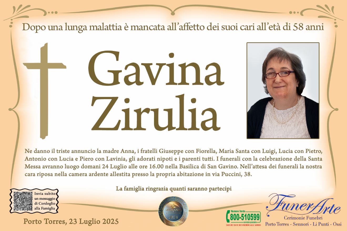 Ne danno il triste annuncio la madre Anna, i fratelli Giuseppe con Fiorella, Maria Santa con Luigi, Lucia con Pietro, Antonio con Lucia e Piero con Lavinia, gli adorati nipoti e i parenti tutti. I funerali con la celebrazione della Santa Messa avranno luogo domani 24 Luglio alle ore 16.00 nella Basilica di San Gavino. Nell’attesa dei funerali la nostra cara riposa nella camera ardente allestita presso la propria abitazione in via Puccini, 38.