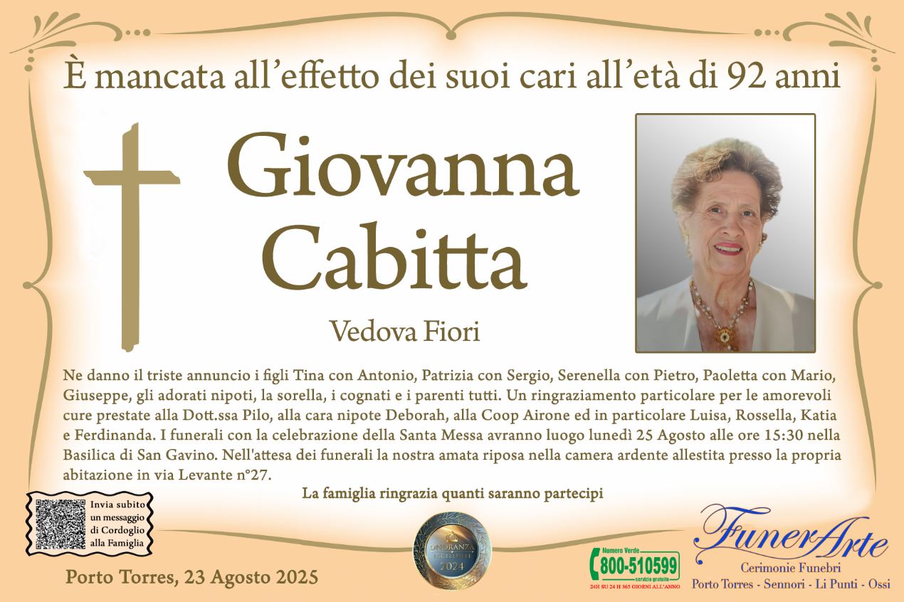 Ne danno il triste annuncio i figli Tina con Antonio, Patrizia con Sergio, Serenella con Pietro, Paoletta con Mario, Giuseppe, gli adorati nipoti, la sorella, i cognati e i parenti tutti. Un ringraziamento particolare per le amorevoli cure prestate alla Dott.ssa Pilo, alla cara nipote Deborah, alla Coop Airone ed in particolare Luisa, Rossella, Katia e Ferdinanda. I funerali con la celebrazione della Santa Messa avranno luogo lunedì 25 Agosto alle ore 15:30 nella Basilica di San Gavino. Nell'attesa dei funerali la nostra amata riposa nella camera ardente allestita presso la propria abitazione in via Levante n°27.