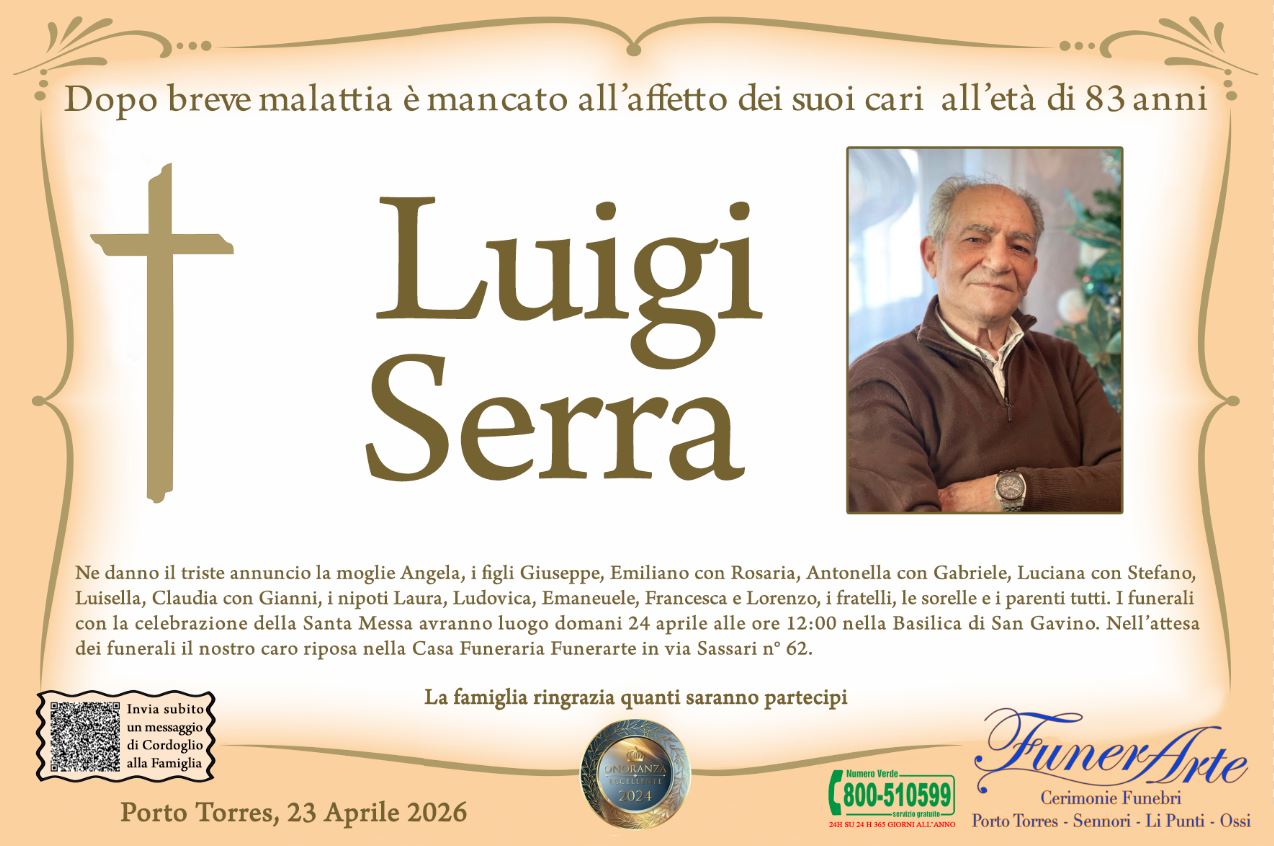 Ne danno il triste annuncio la moglie Angela, i figli Giuseppe, Emiliano con Rosaria, Antonella con Gabriele, Luciana con Stefano, Luisella, Claudia con Gianni, i nipoti Laura, Ludovica, Emaneuele, Francesca e Lorenzo, i fratelli, le sorelle e i parenti tutti. I funerali con la celebrazione della Santa Messa avranno luogo domani 24 aprile alle ore 12:00 nella Basilica di San Gavino. Nell’attesa dei funerali il nostro caro riposa nella Casa Funeraria Funerarte in via Sassari n° 62.
