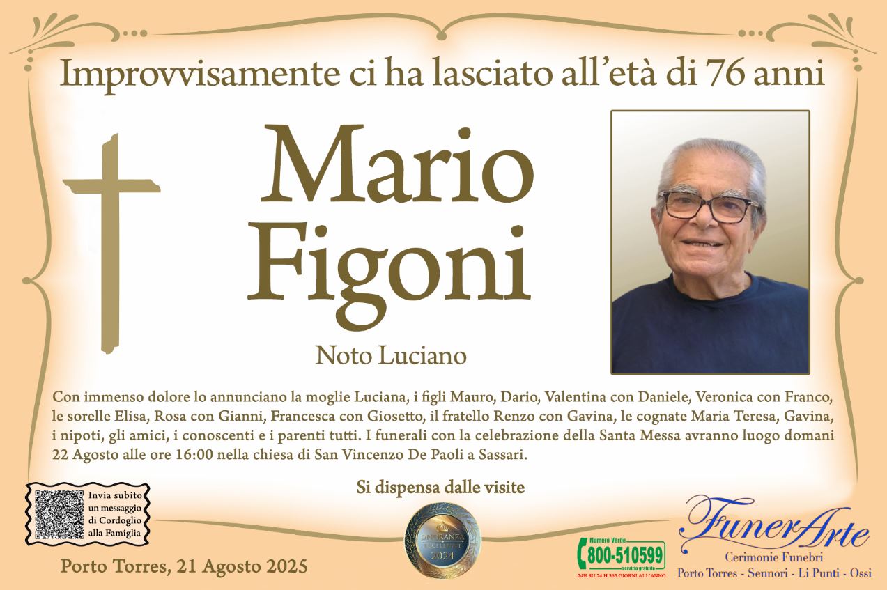 Con immenso dolore lo annunciano la moglie Luciana, i figli Mauro, Dario, Valentina con Daniele, Veronica con Franco, le sorelle Elisa, Rosa con Gianni, Francesca con Giosetto, il fratello Renzo con Gavina, le cognate Maria Teresa, Gavina, i nipoti, gli amici, i conoscenti e i parenti tutti. I funerali con la celebrazione della Santa Messa avranno luogo domani 22 Agosto alle ore 16:00 nella chiesa di San Vincenzo De Paoli a Sassari.