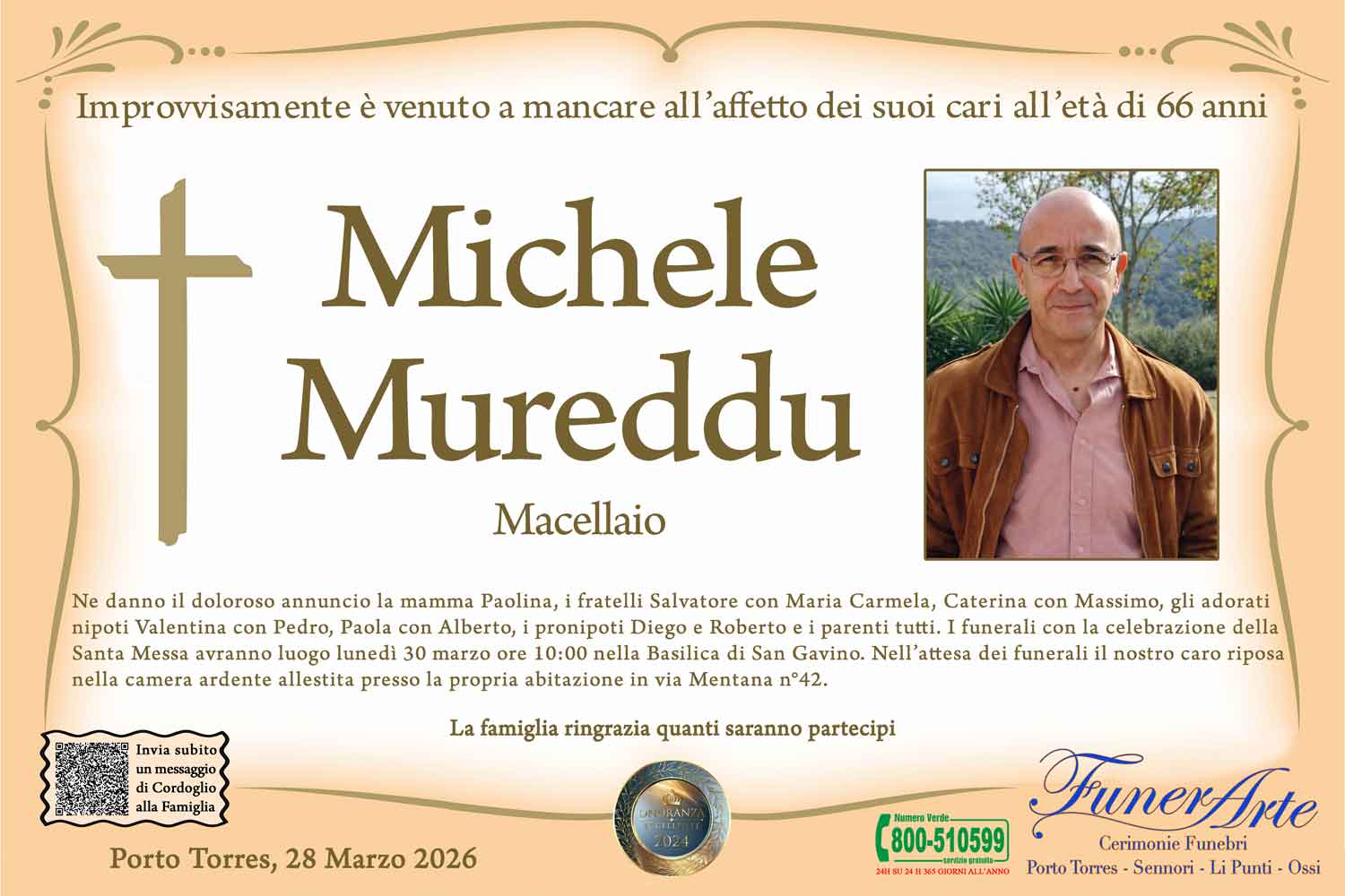 Ne danno il doloroso annuncio la mamma Paolina, i fratelli Salvatore con Maria Carmela, Caterina con Massimo, gli adorati nipoti Valentina con Pedro, Paola con Alberto, i pronipoti Diego e Roberto e i parenti tutti. I funerali con la celebrazione della Santa Messa avranno luogo lunedì 30 marzo alle ore 10:00 nella Basilica di San Gavino. Nell’attesa dei funerali il nostro caro riposa nella camera ardente allestita presso la propria abitazione in via Mentana n°42.