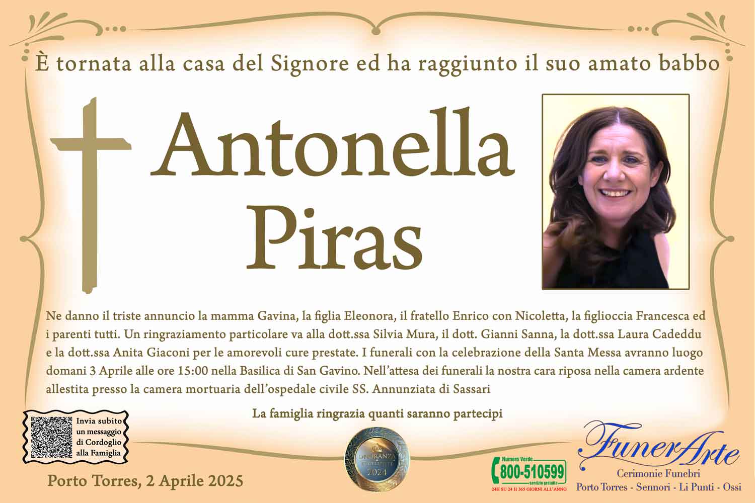 Ne danno il triste annuncio la mamma Gavina, la figlia Eleonora, il fratello Enrico con Nicoletta, la figlioccia Francesca ed i parenti tutti. Un ringraziamento particolare va alla dott.ssa Silvia Mura, il dott. Gianni Sanna, la dott.ssa Laura Cadeddu e la dott.ssa Anita Giaconi per le amorevoli cure prestate. I funerali con la celebrazione della Santa Messa avranno luogo domani 3 Aprile alle ore 15:00 nella Basilica di San Gavino. Nell’attesa dei funerali la nostra cara riposa nella camera ardente allestita presso la camera mortuaria dell’ospedale civile SS. Annunziata di Sassari.