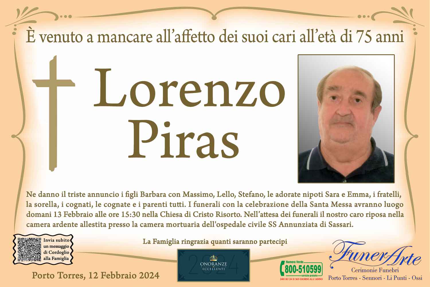 NE DANNO IL TRISTE ANNUNCIO I FIGLI BARBARA CON MASSIMO, LELLO, STEFANO, LE ADORATE NIPOTI SARA E EMMA, I FRATELLI, LE SORELLE, I COGNATI LE COGNATE E I PARENTI TUTTI. I FUNERALI CON LA CELEBRAZIONE DELLA SANTA MESSA AVRANNO LUOGO DOMANI 13 FEBBRAIO ALLE ORE 15:30 NELLA CHIESA DI CRISTO RISORTO. NELL' ATTESA DEI FUNERALI IL NOSTRO CARO RIPOSA NELLA CAMERA ARDENTE ALLESTITA PRESSO LA CAMERA MORTUARIA DELL' OSPEDALE CIVILE SS ANNUNZIATA DI SASSARI.