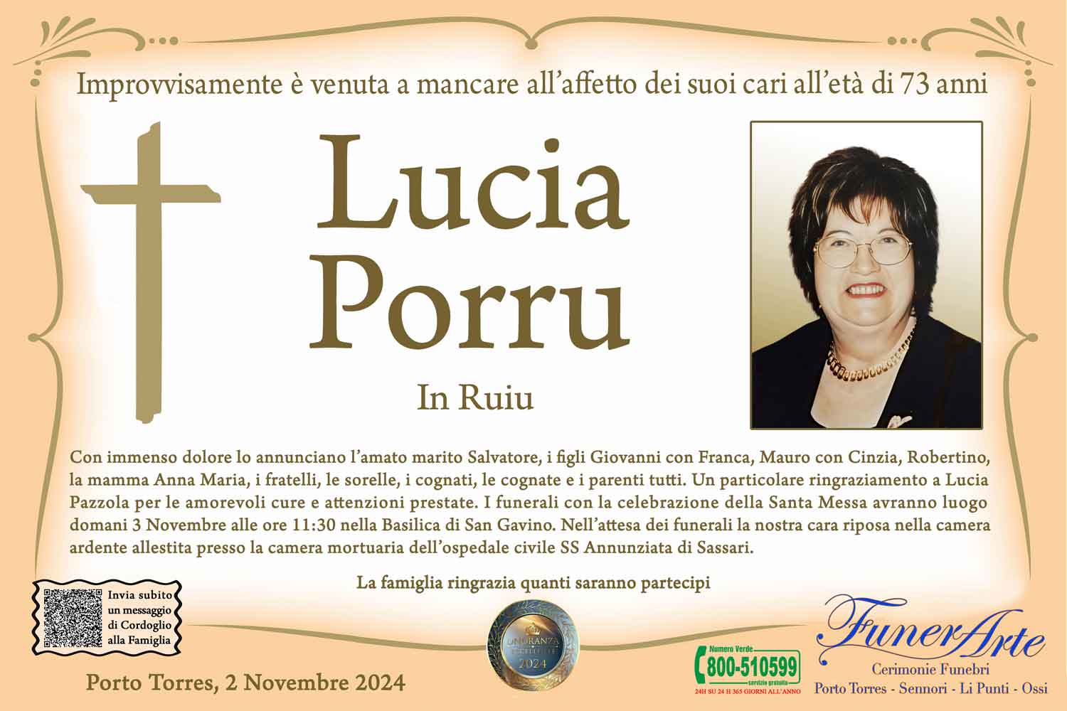 Con immenso dolore lo annunciano l’amato marito Salvatore, i figli Giovanni con Franca, Mauro con Cinzia, Robertino, la mamma Anna Maria, i fratelli, le sorelle, i cognati, le cognate e i parenti tutti. Un particolare ringraziamento a Lucia Pazzola per le amorevoli cure e attenzioni prestate. I funerali con la celebrazione della Santa Messa avranno luogo domani 3 Novembre alle ore 11:30 nella Basilica di San Gavino. Nell’attesa dei funerali la nostra cara riposa nella camera ardente allestita presso la camera mortuaria dell’ospedale civile SS Annunziata di Sassari.