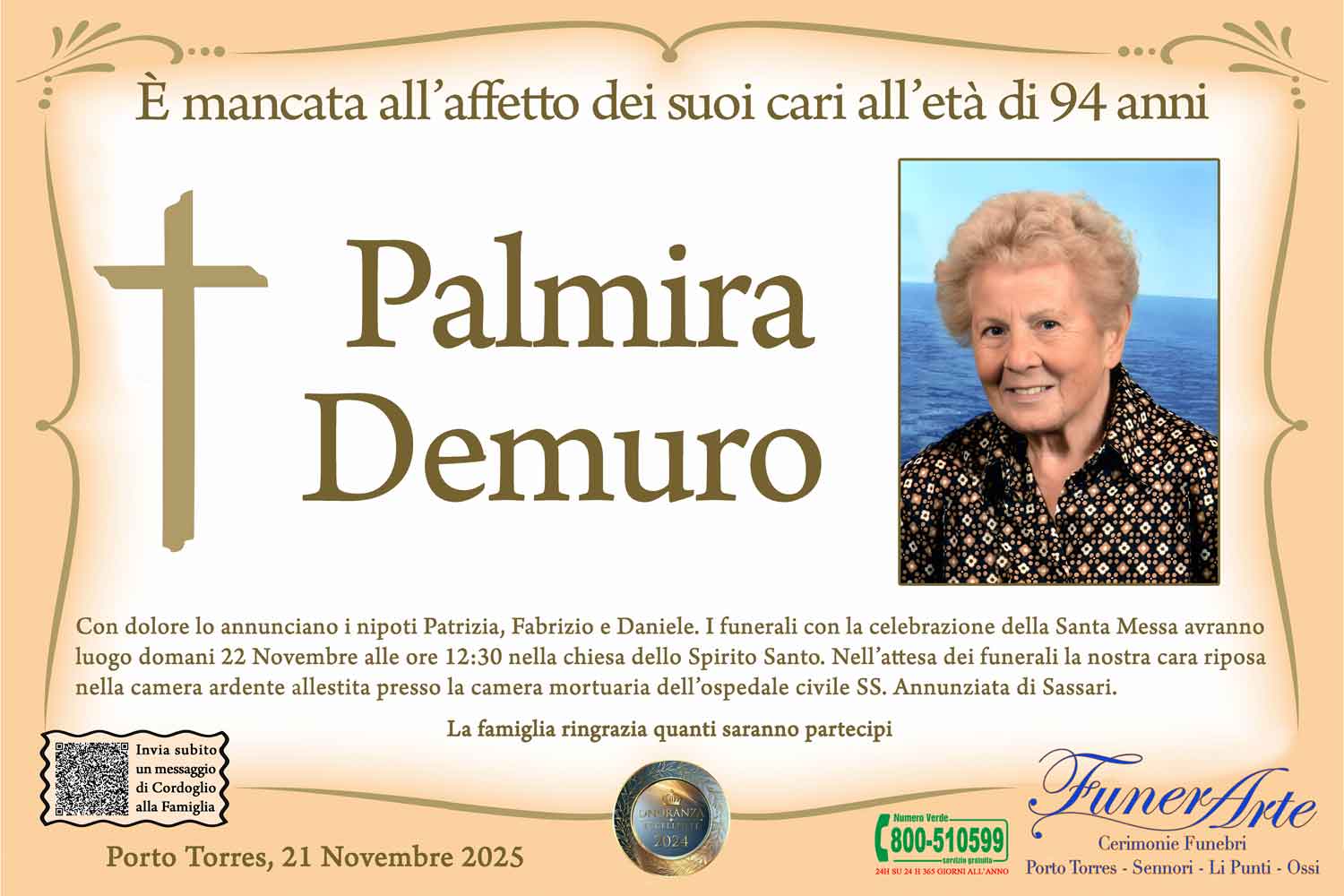 Con dolore lo annunciano i nipoti Patrizia, Fabrizio e Daniele. I funerali con la celebrazione della Santa Messa avranno luogo domani 22 Novembre alle ore 12:30 nella chiesa dello Spirito Santo. Nell’attesa dei funerali la nostra cara riposa nella camera ardente allestita presso la camera mortuaria dell’ospedale civile SS. Annunziata di Sassari.