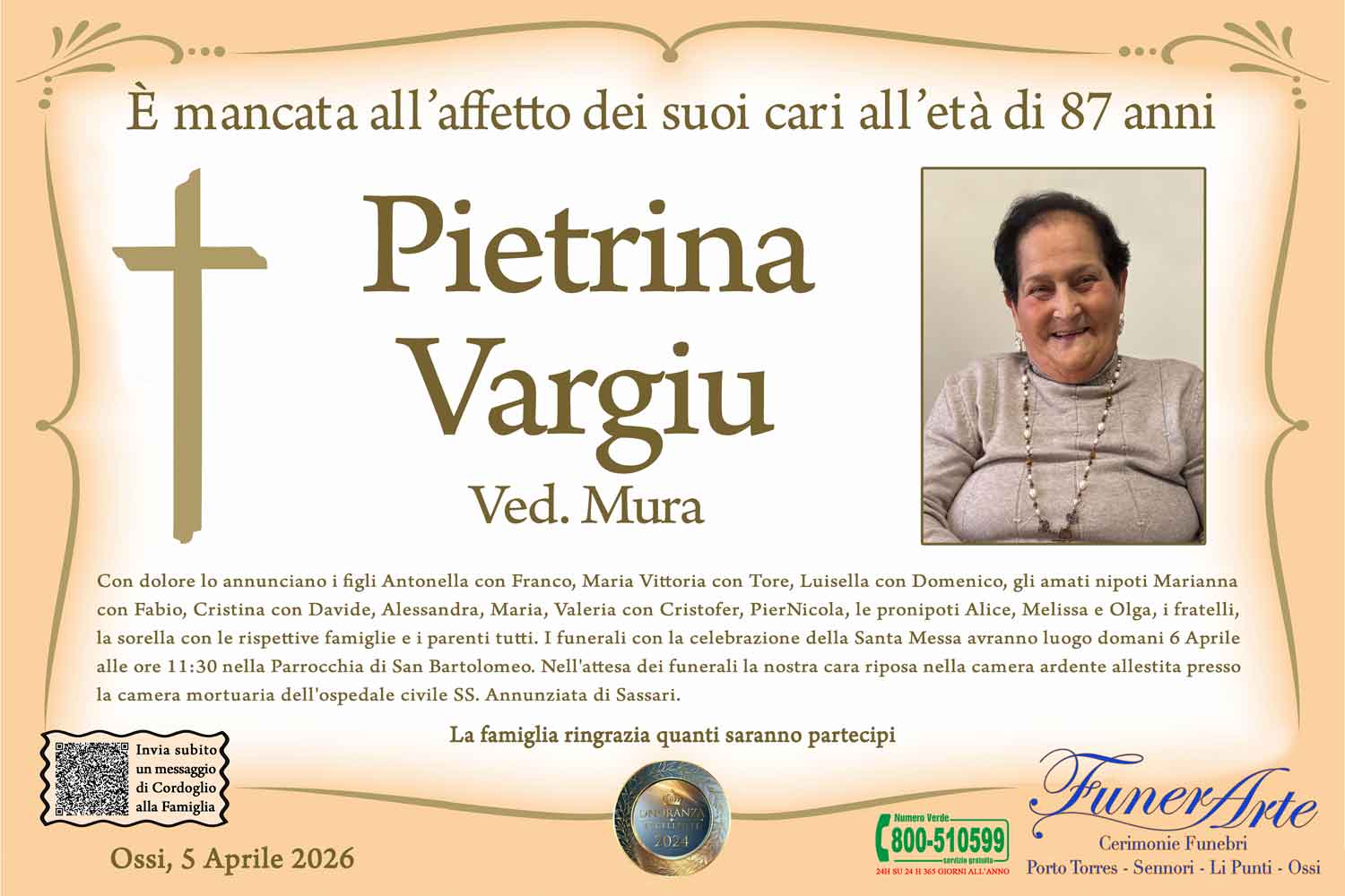 Con dolore lo annunciano i figli Antonella con Franco, Maria Vittoria con Tore, Luisella con Domenico, gli amati nipoti Marianna con Fabio, Cristina con Davide, Alessandra, Maria, Valeria con Cristofer, PierNicola, le pronipoti Alice, Melissa e Olga, i fratelli, la sorella con le rispettive famiglie e i parenti tutti. I funerali con la celebrazione della Santa Messa avranno luogo domani 6 Aprile alle ore 11:30 nella Parrocchia di San Bartolomeo. Nell'attesa dei funerali la nostra cara riposa nella camera ardente allestita presso la camera mortuaria dell'ospedale civile SS. Annunziata di Sassari.