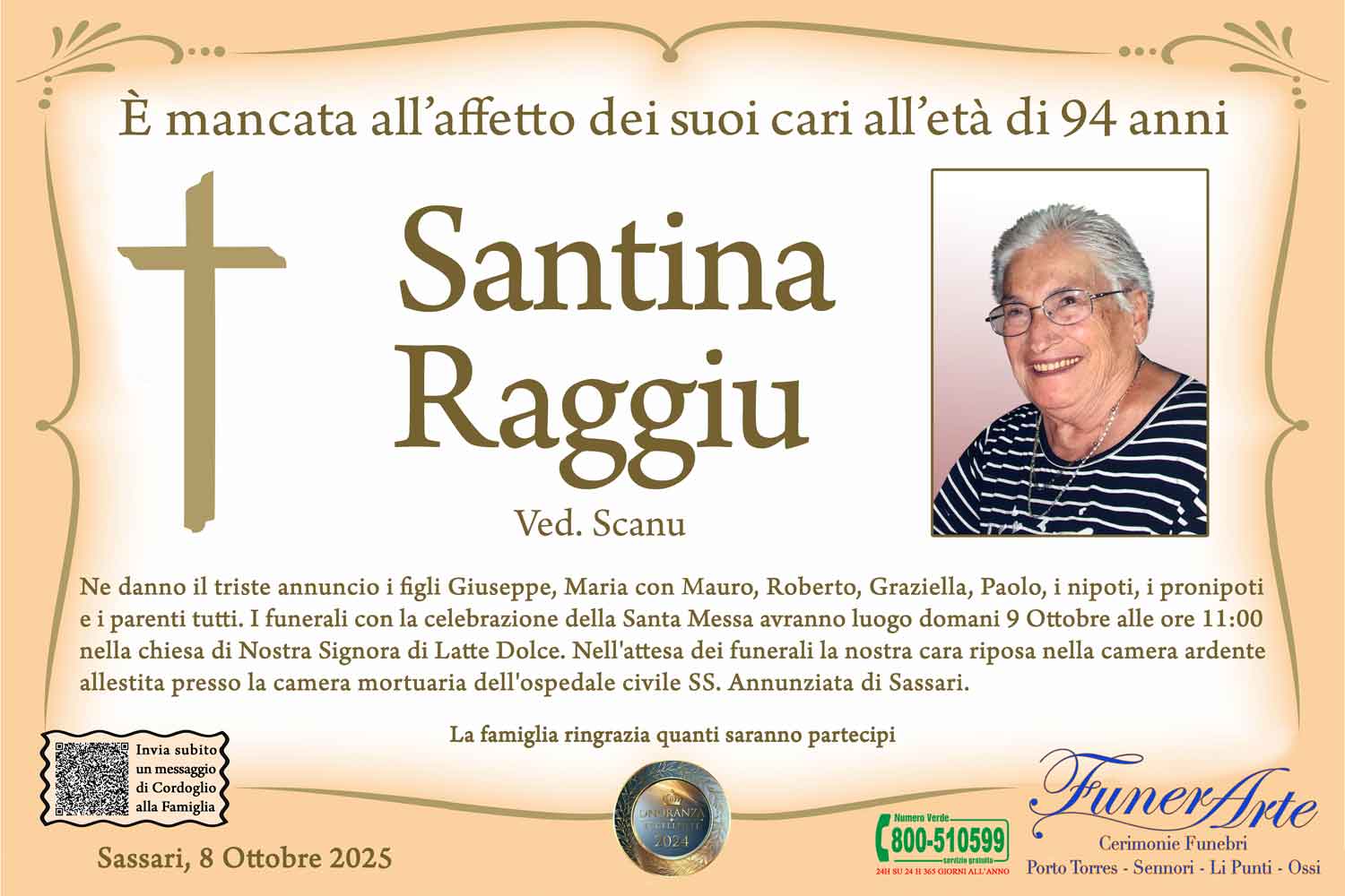 Ne danno il triste annuncio i figli Giuseppe, Maria con Mauro, Roberto, Graziella, Paolo, i nipoti, i pronipoti e i parenti tutti. I funerali con la celebrazione della Santa Messa avranno luogo domani 9 Ottobre alle ore 11:00 nella chiesa di Nostra Signora di Latte Dolce. Nell'attesa dei funerali la nostra cara riposa nella camera ardente allestita presso la camera mortuaria dell'ospedale civile SS. Annunziata di Sassari.