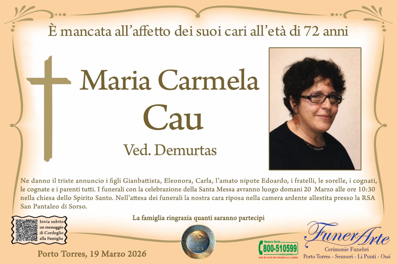 Ne danno il triste annuncio i figli Gianbattista, Eleonora, Carla, l’amato nipote Edoardo, i fratelli, le sorelle, i cognati, le cognate e i parenti tutti. I funerali con la celebrazione della Santa Messa avranno luogo domani 20 Marzo alle ore 10:30 nella chiesa dello Spirito Santo. Nell’attesa dei funerali la nostra cara riposa nella camera ardente allestita presso la RSA San Pantaleo di Sorso.
