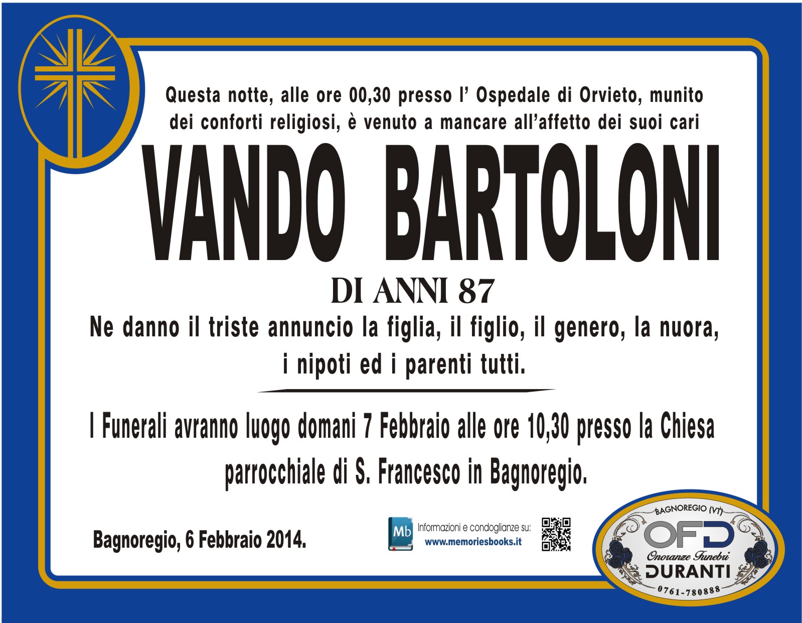 Clicca il pulsante qui sotto per visualizzare sulla mappa il luogo dove riposa Vando Bartoloni.